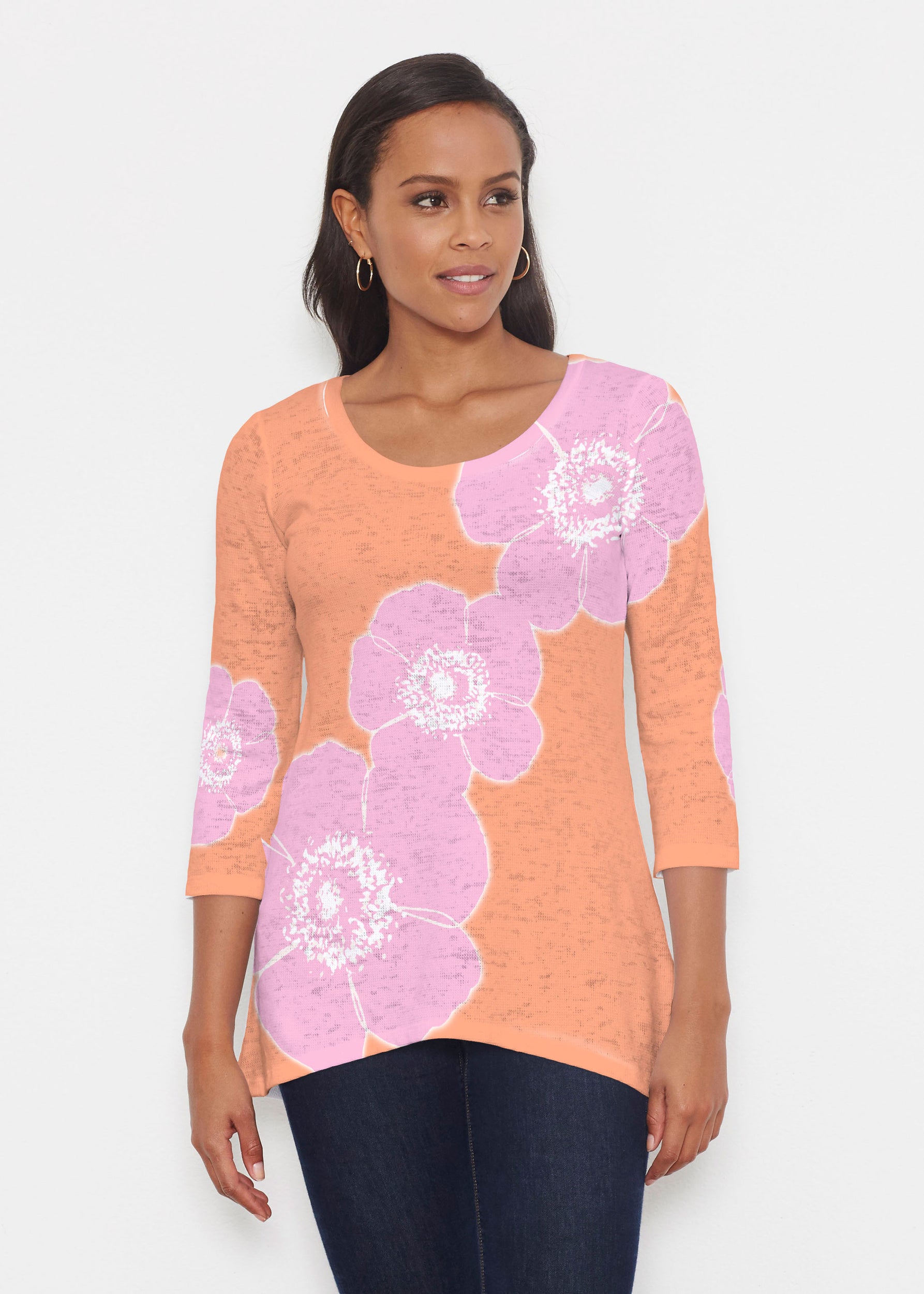 An elegant fit, the hemline falls higher in front then cascades beautifully down across back. Delicate scoop neckline and 3/4 sleeves made in our soft Baby Waffle burnout thermal blend.