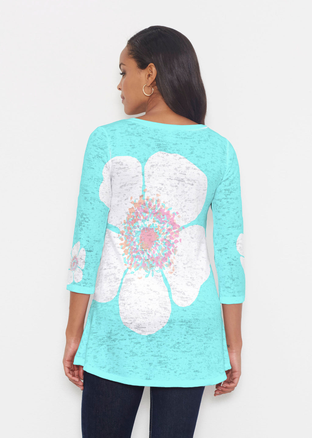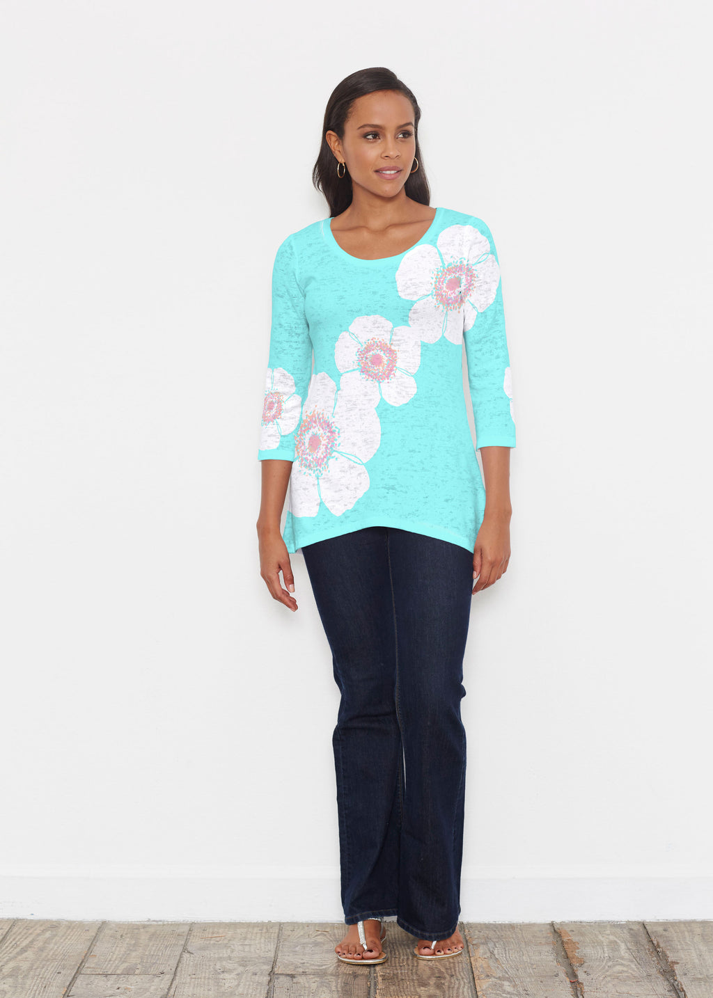 An elegant fit, the hemline falls higher in front then cascades beautifully down across back. Delicate scoop neckline and 3/4 sleeves made in our soft Baby Waffle burnout thermal blend.