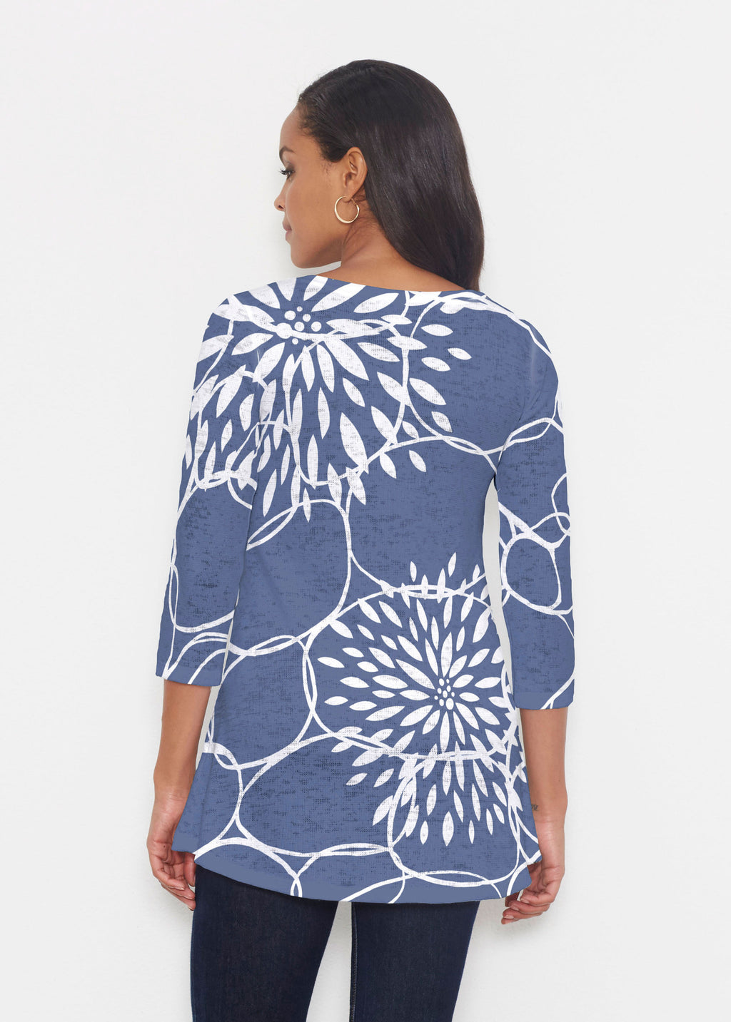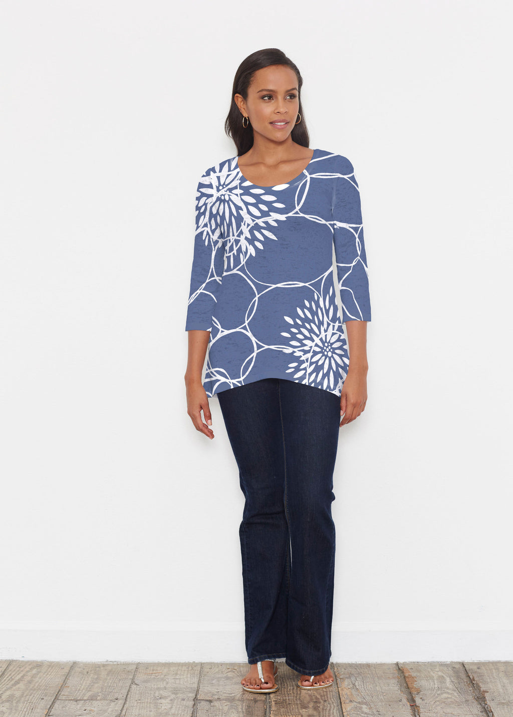 An elegant fit, the hemline falls higher in front then cascades beautifully down across back. Delicate scoop neckline and 3/4 sleeves made in our soft Baby Waffle burnout thermal blend.