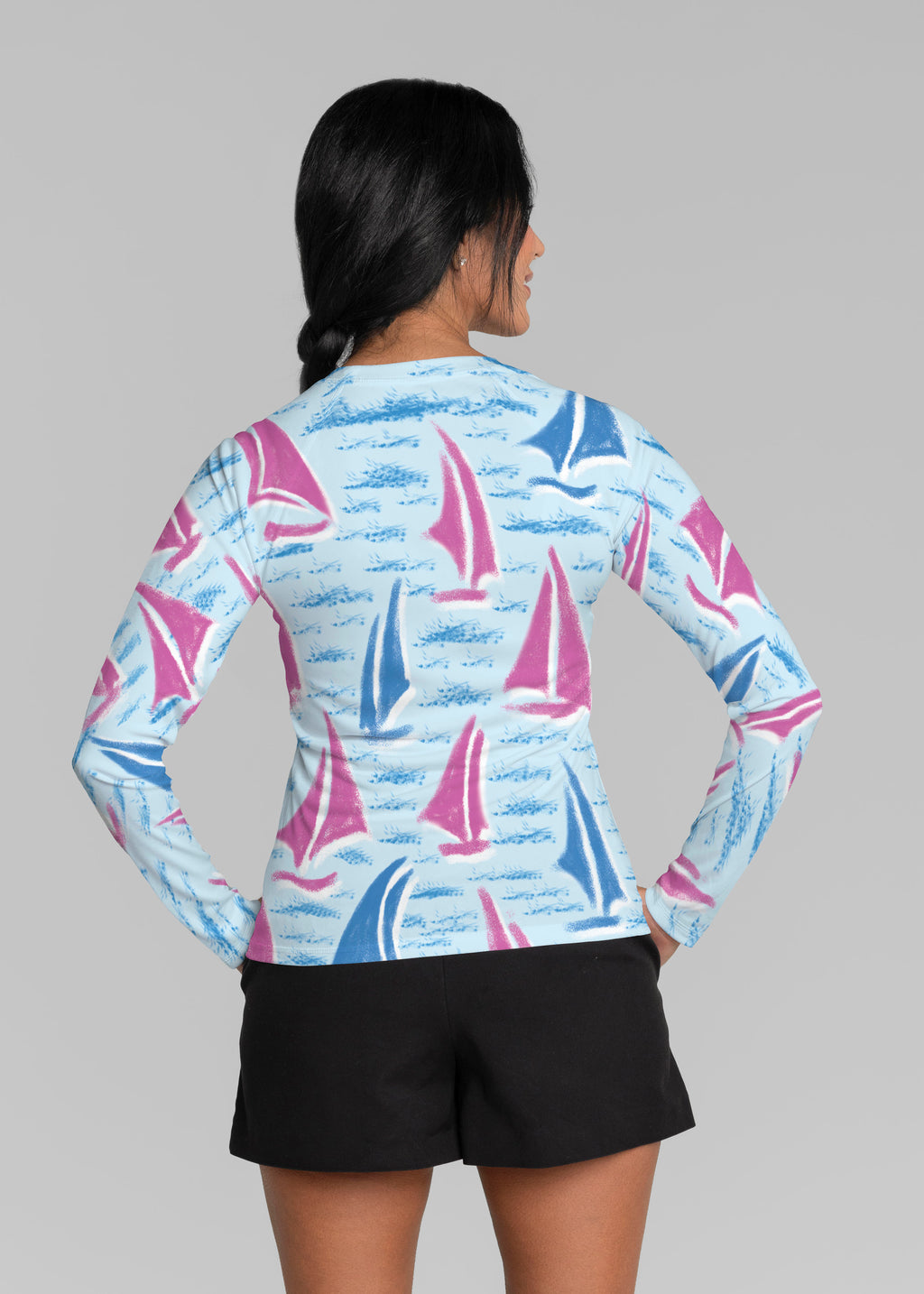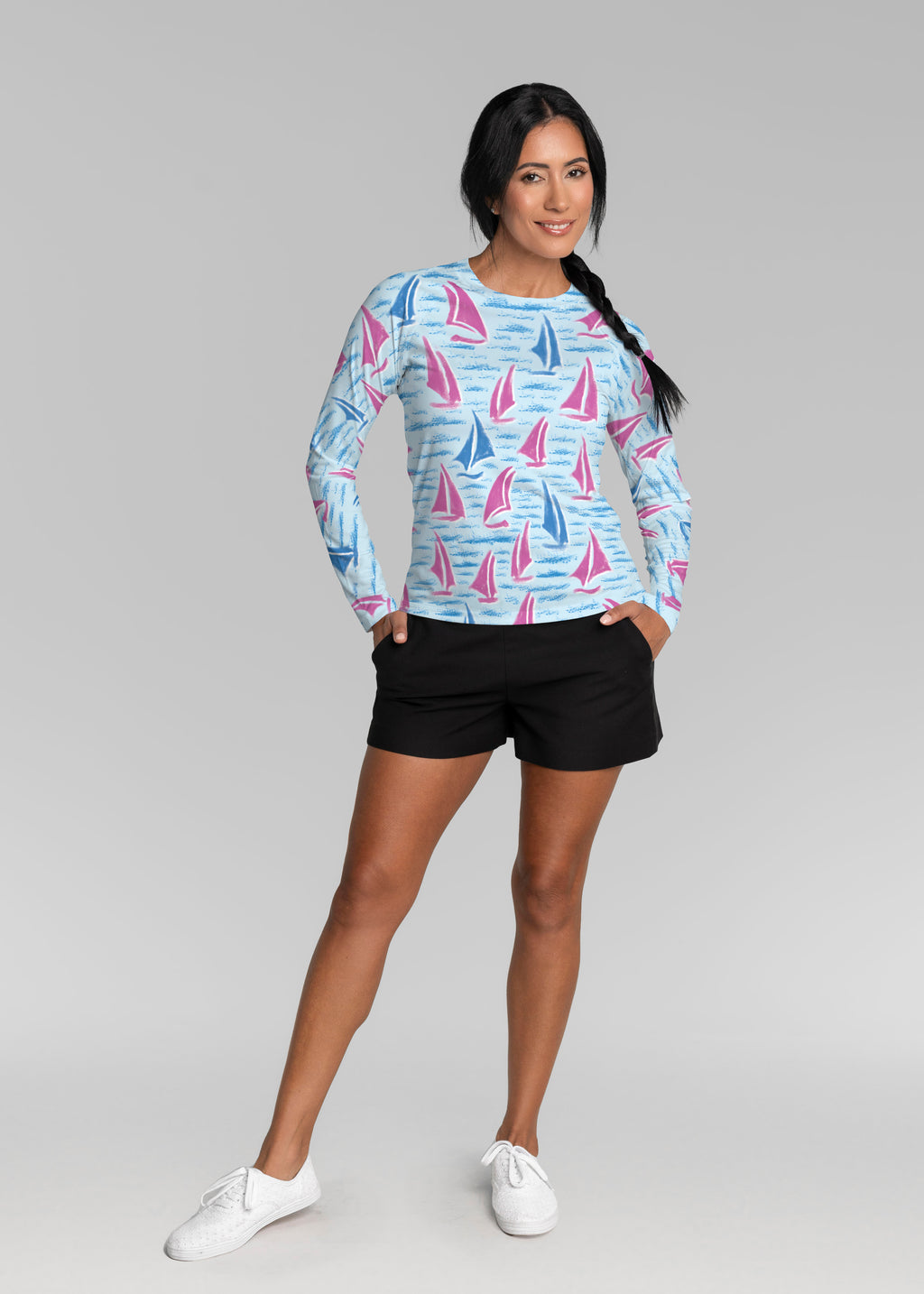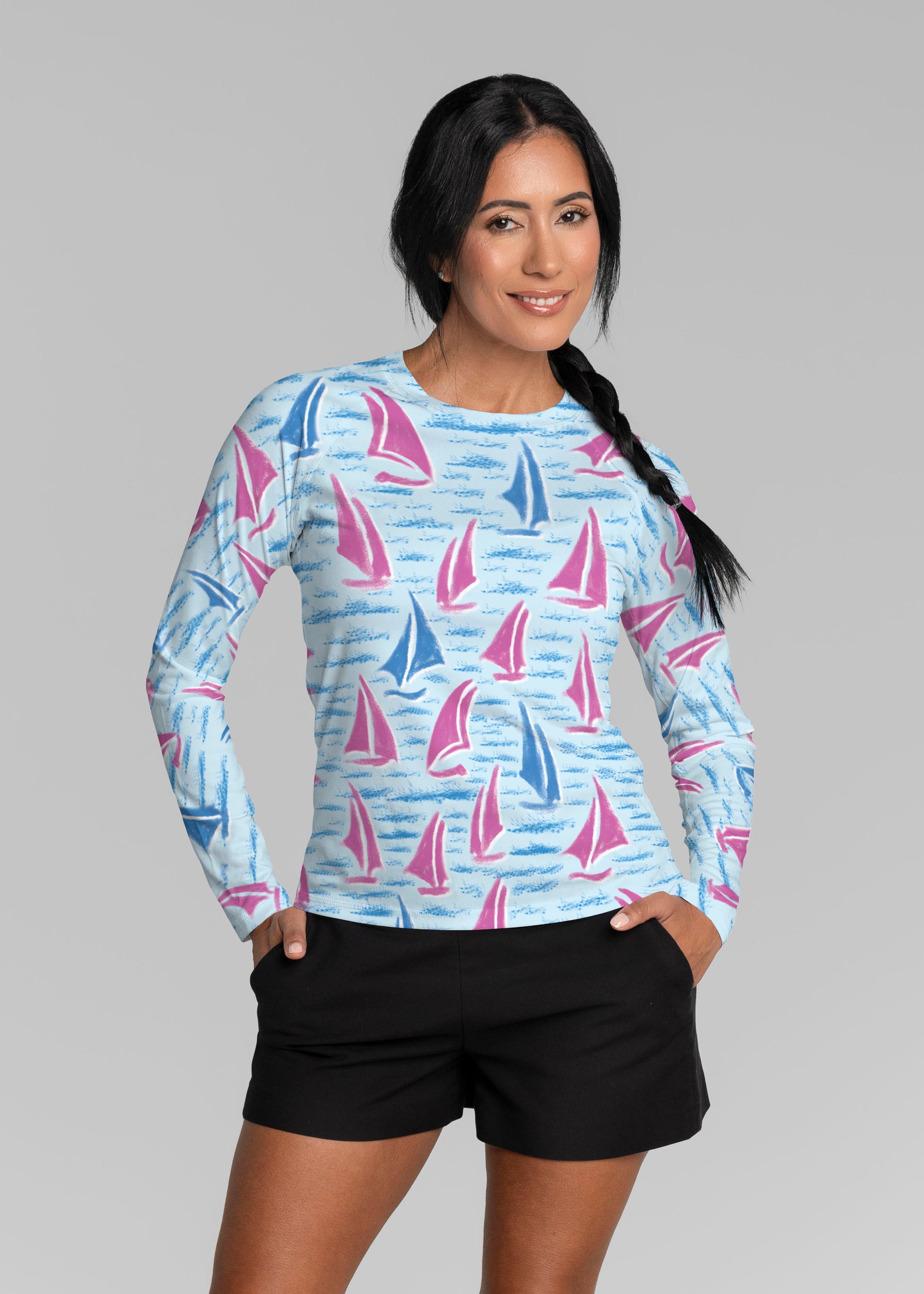 Our WHIMSY ROSE™ Safe Sun UPF 50+ long sleeve, crew neck rash guard offers versatile, beach-to-bistro style, supreme comfort, and an activewear fit. Made in a specially designed Safe Sun textile that blocks more harmful rays and provides a smart solution for those who love to swim, surf, kayak, canoe, waterski, boat, or simply relax waterside.