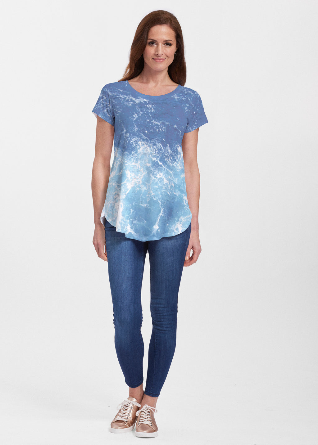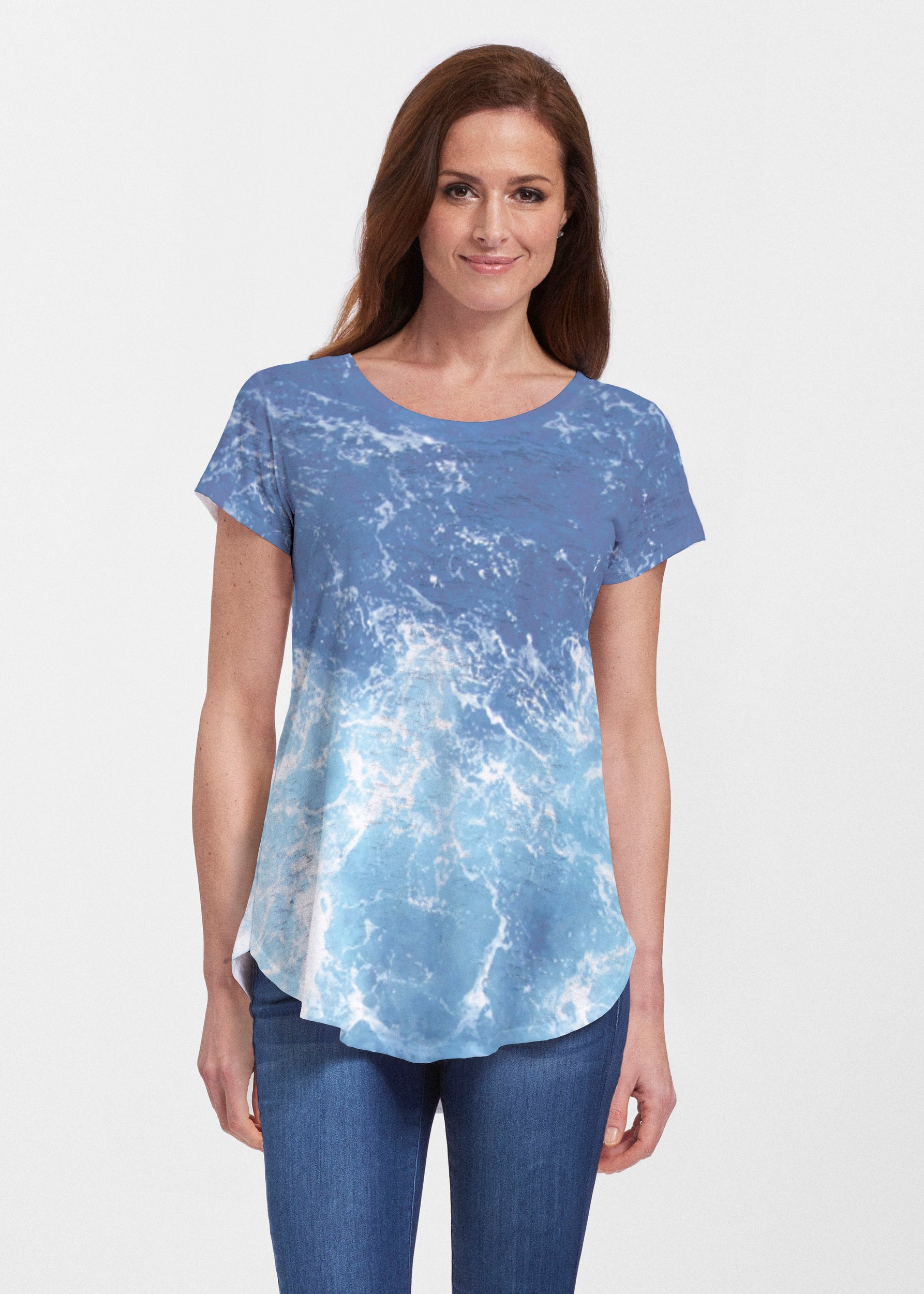 An effortlessly flattering tunic in our soft Signature burnout fabric featuring short sleeves and a scoop neck with a body that flows into a full, swinging shirttail hem.