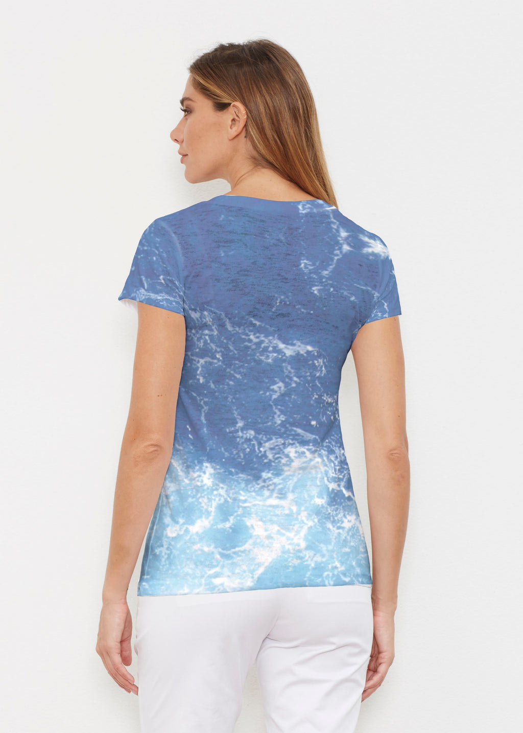 Created in soft, casual burn-out Signature blend, this tee features a subtle v-neck and cap sleeves. -- Your one-of-a-kind garment is created using all-over soft garment sublimation printing. Selected designs are individually printed into your garment. Cotton/Polyester blend.