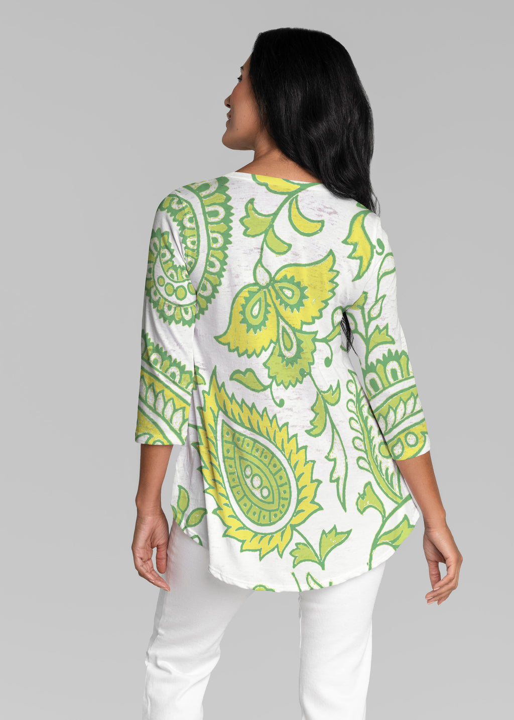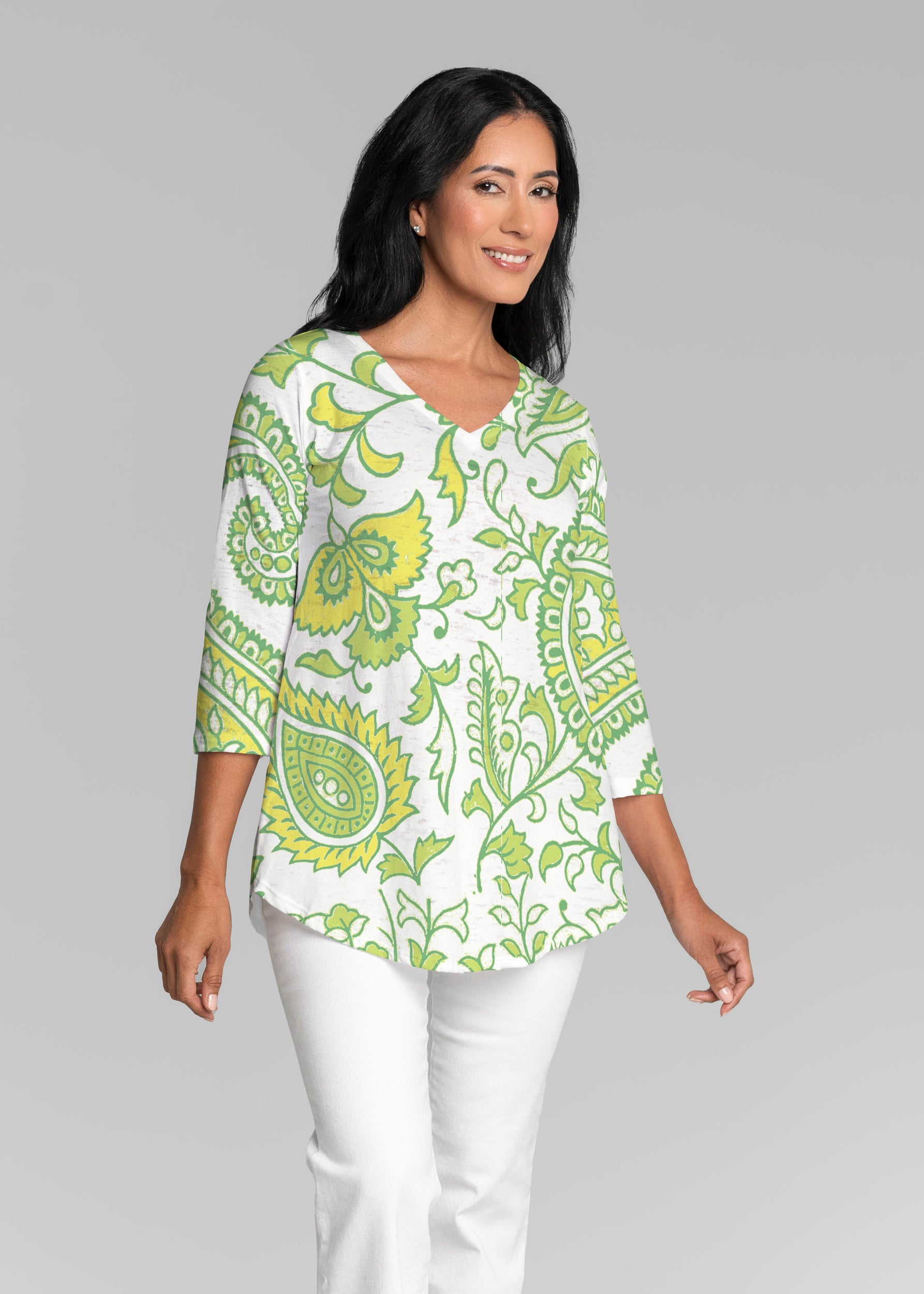 This v-neck tunic in our Signature burnout fabric is forever flattering. 3/4 sleeves and a v-neck flow into a full, swinging shirttail hem.