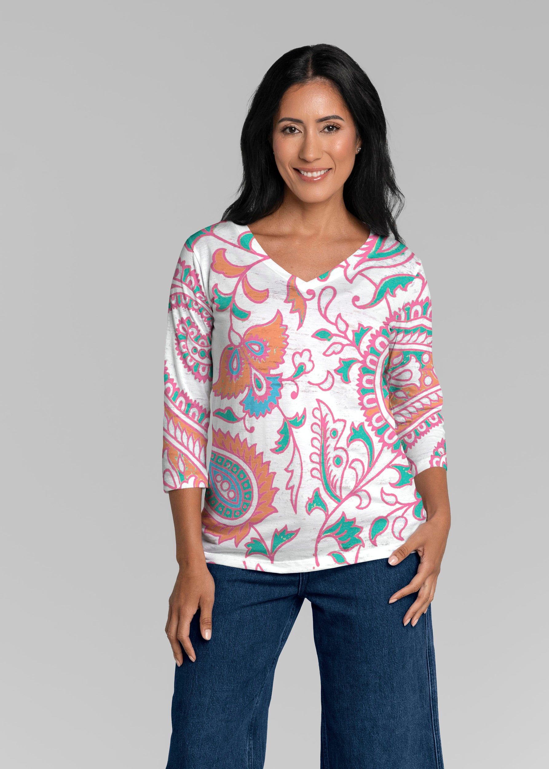 Our casual Signature 3/4 sleeve has a subtle v-neck and is perfectly proportioned and a new best-selling favorite. This relaxed fit is not only flattering but you get to pick that special print for any mood.