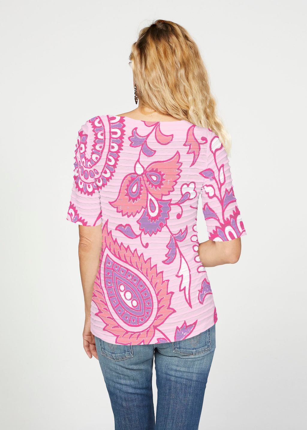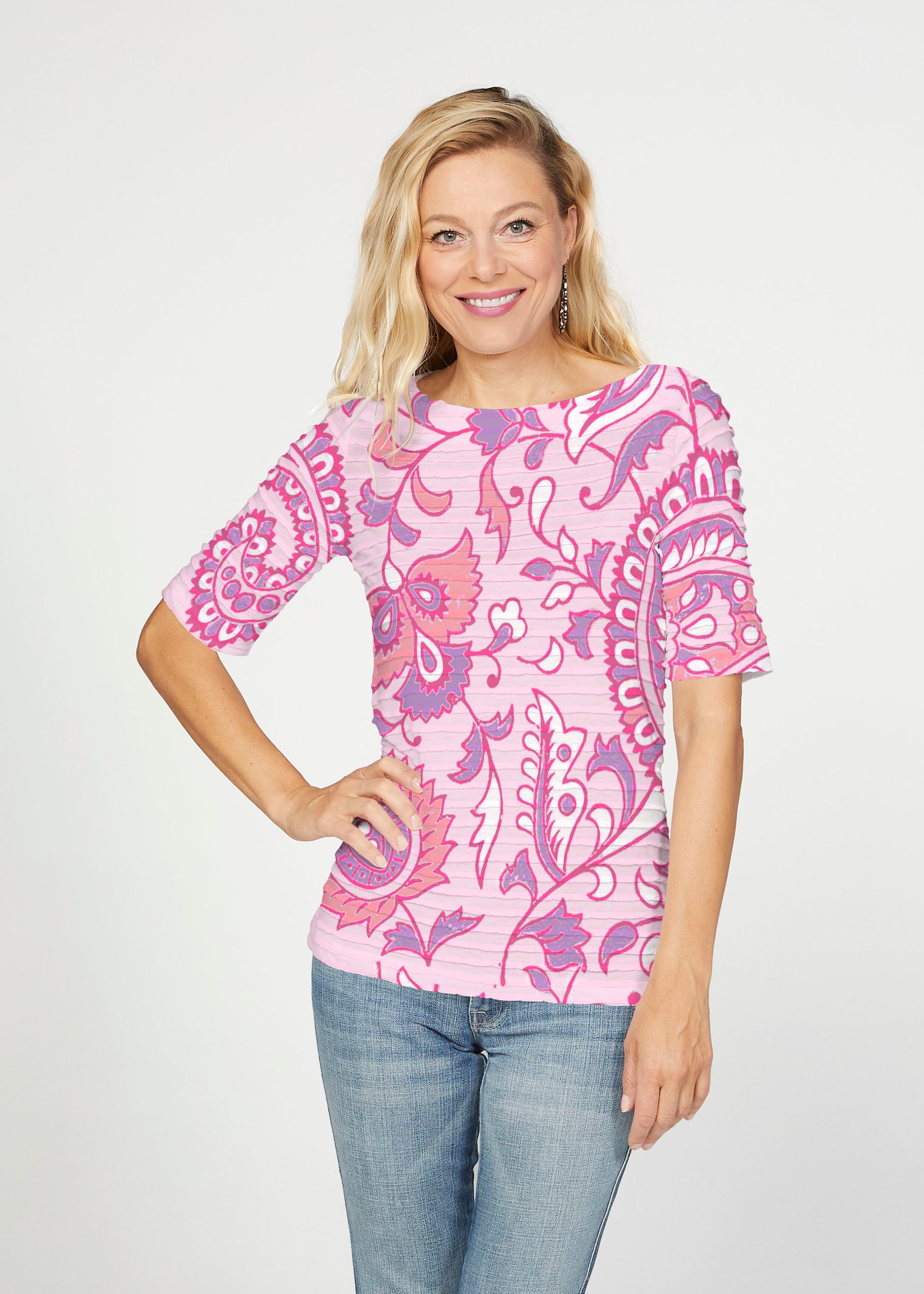The uniquely soft, pleated texture in this Banded fabric gives the elbow sleeve and boat neck top a fun and sophisticated look. Easy relaxed fit with a hemline that comes below the hip.