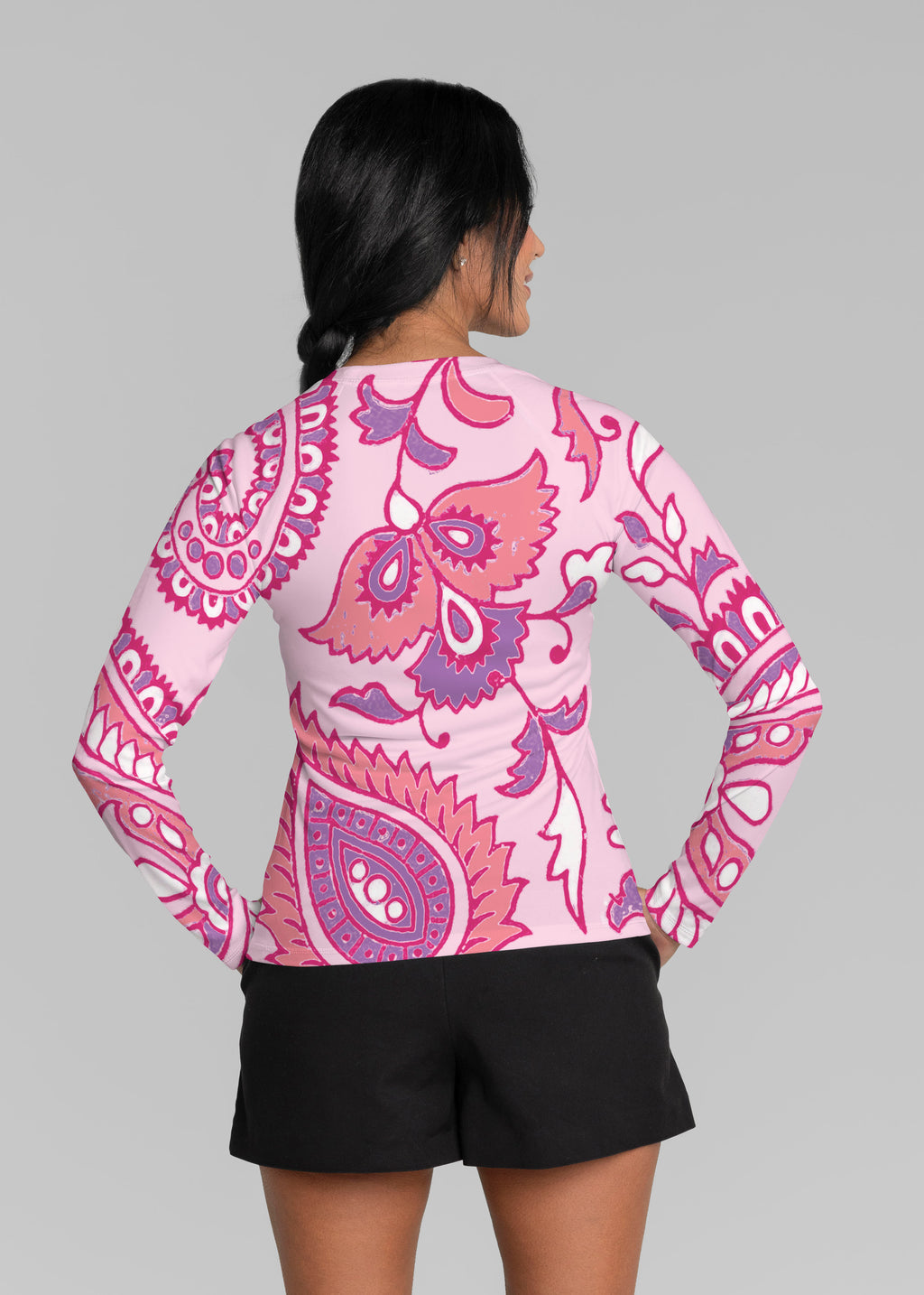 Our WHIMSY ROSE™ Safe Sun UPF 50+ long sleeve, crew neck rash guard offers versatile, beach-to-bistro style, supreme comfort, and an activewear fit. Made in a specially designed Safe Sun textile that blocks more harmful rays and provides a smart solution for those who love to swim, surf, kayak, canoe, waterski, boat, or simply relax waterside.