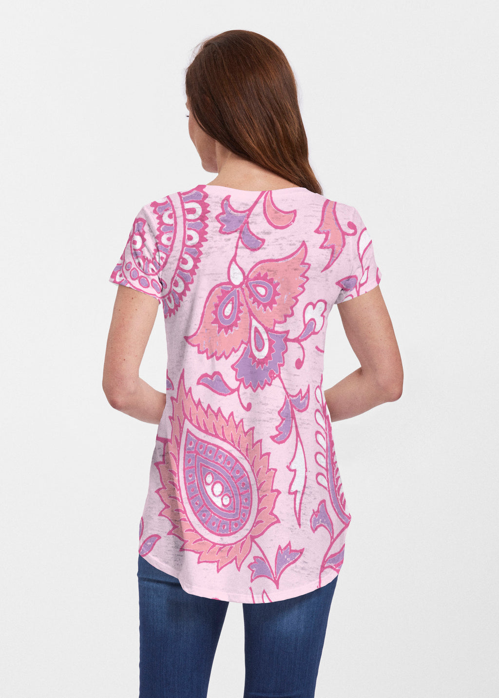 An effortlessly flattering tunic in our soft Signature burnout fabric featuring short sleeves and a scoop neck with a body that flows into a full, swinging shirttail hem.