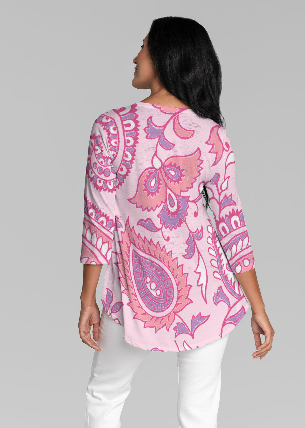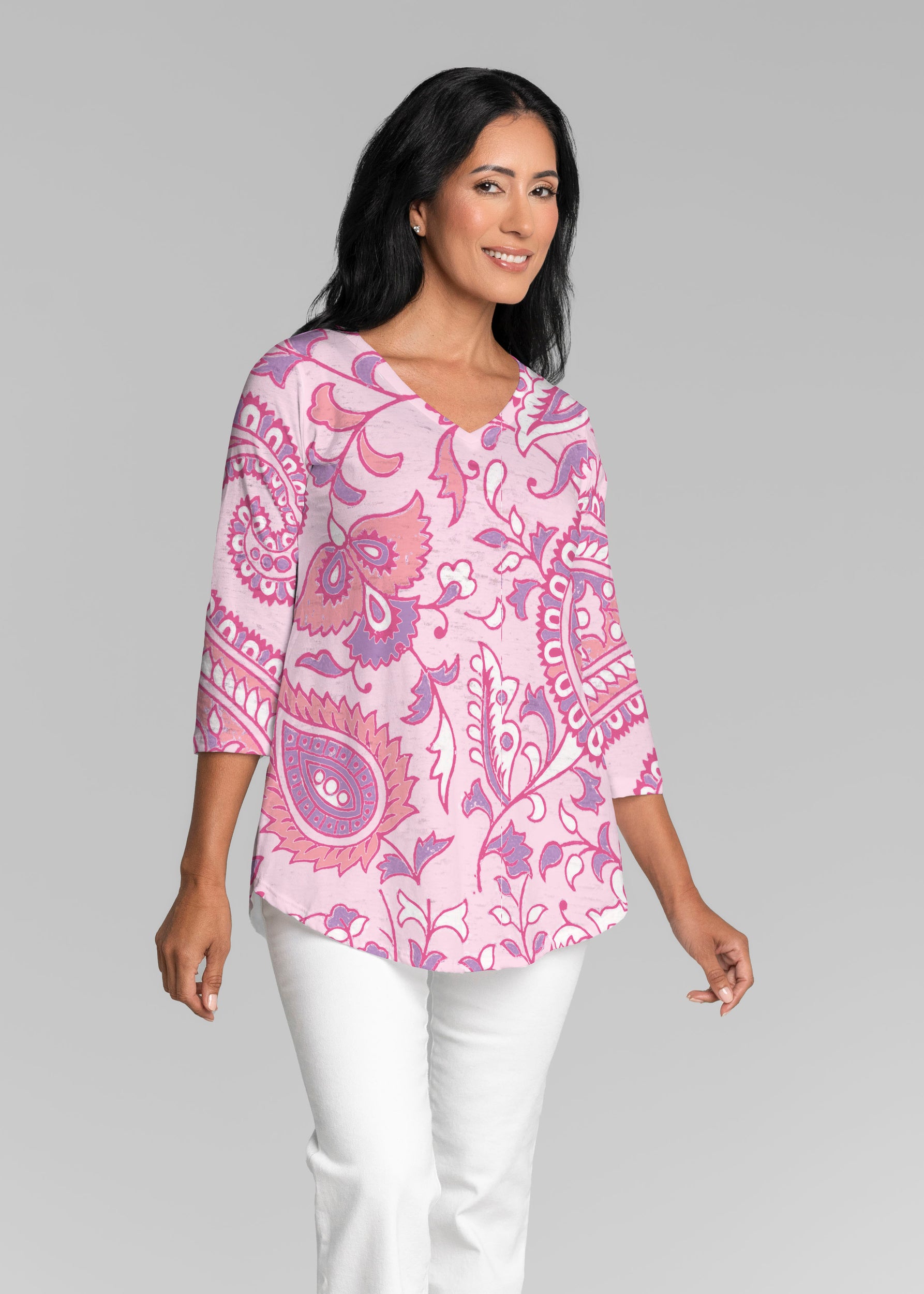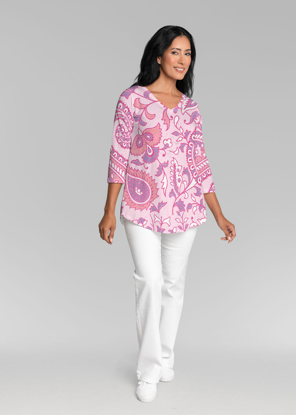 This v-neck tunic in our Signature burnout fabric is forever flattering. 3/4 sleeves and a v-neck flow into a full, swinging shirttail hem.