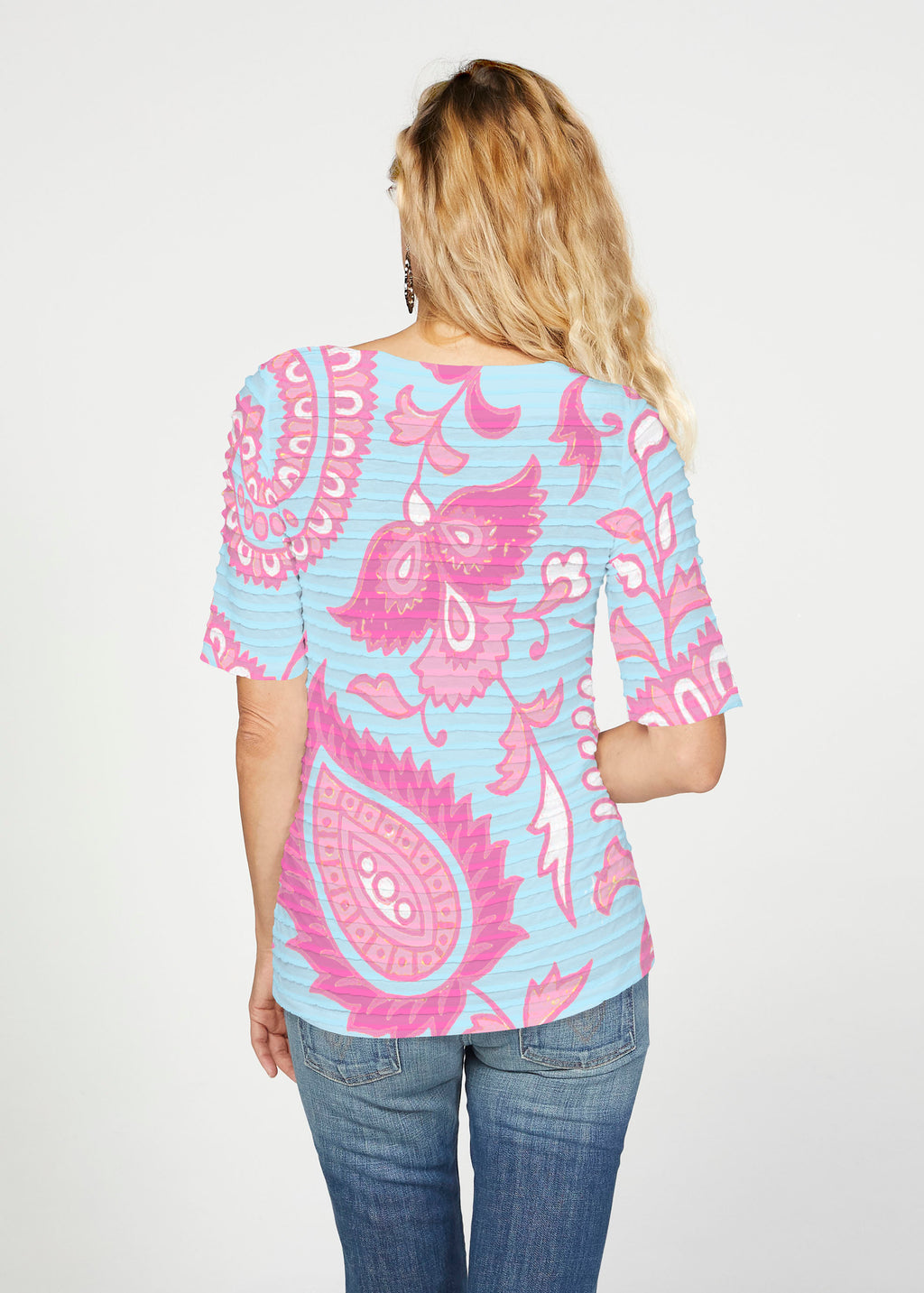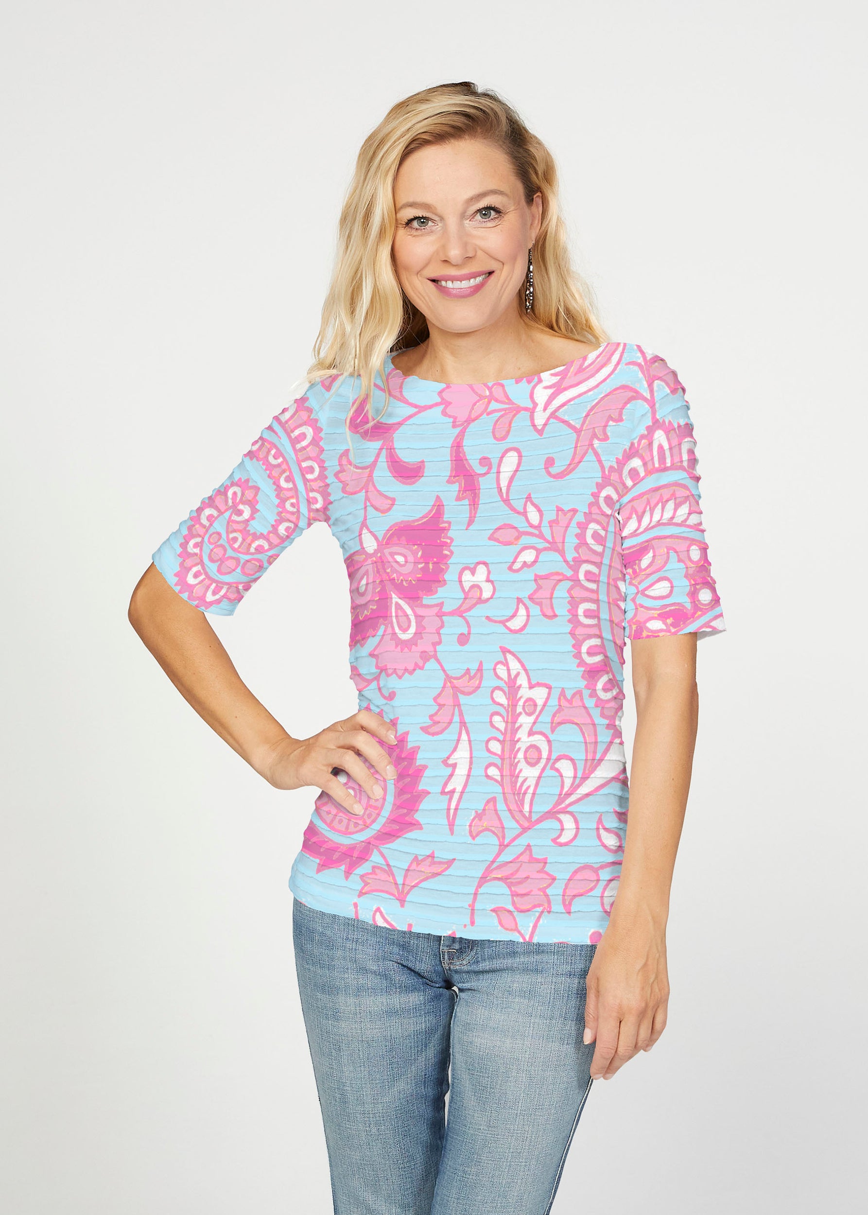 The uniquely soft, pleated texture in this Banded fabric gives the elbow sleeve and boat neck top a fun and sophisticated look. Easy relaxed fit with a hemline that comes below the hip.