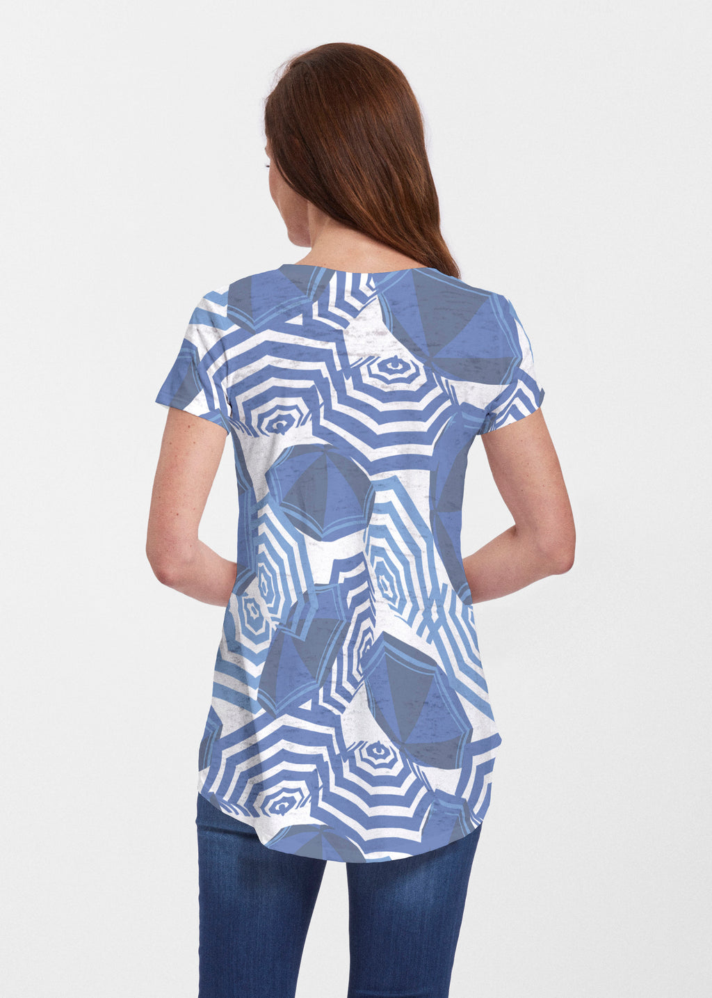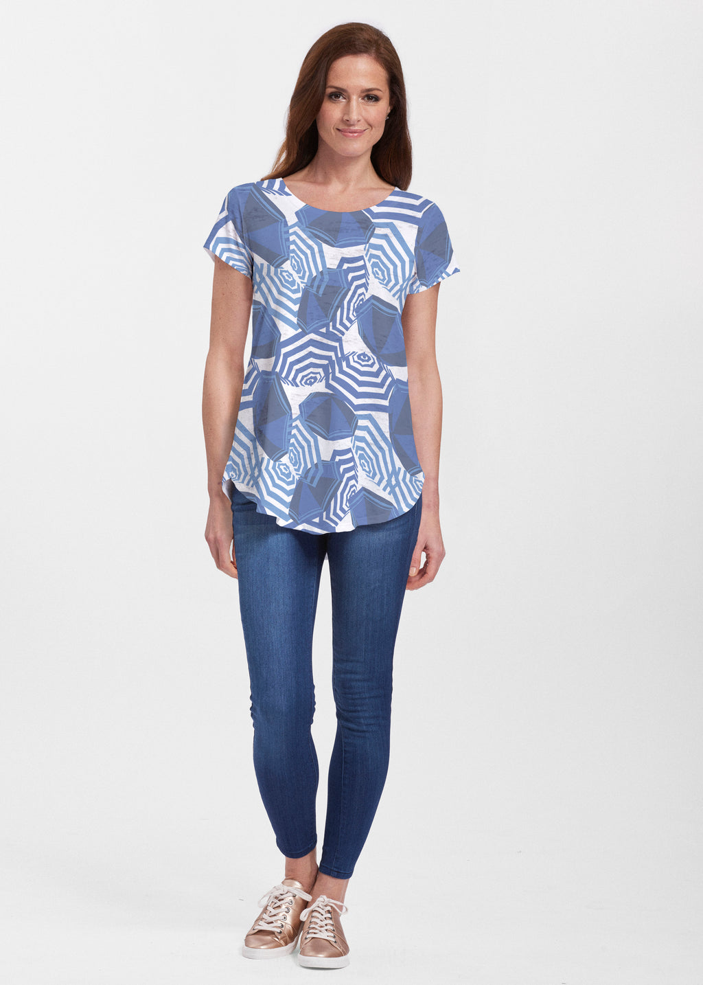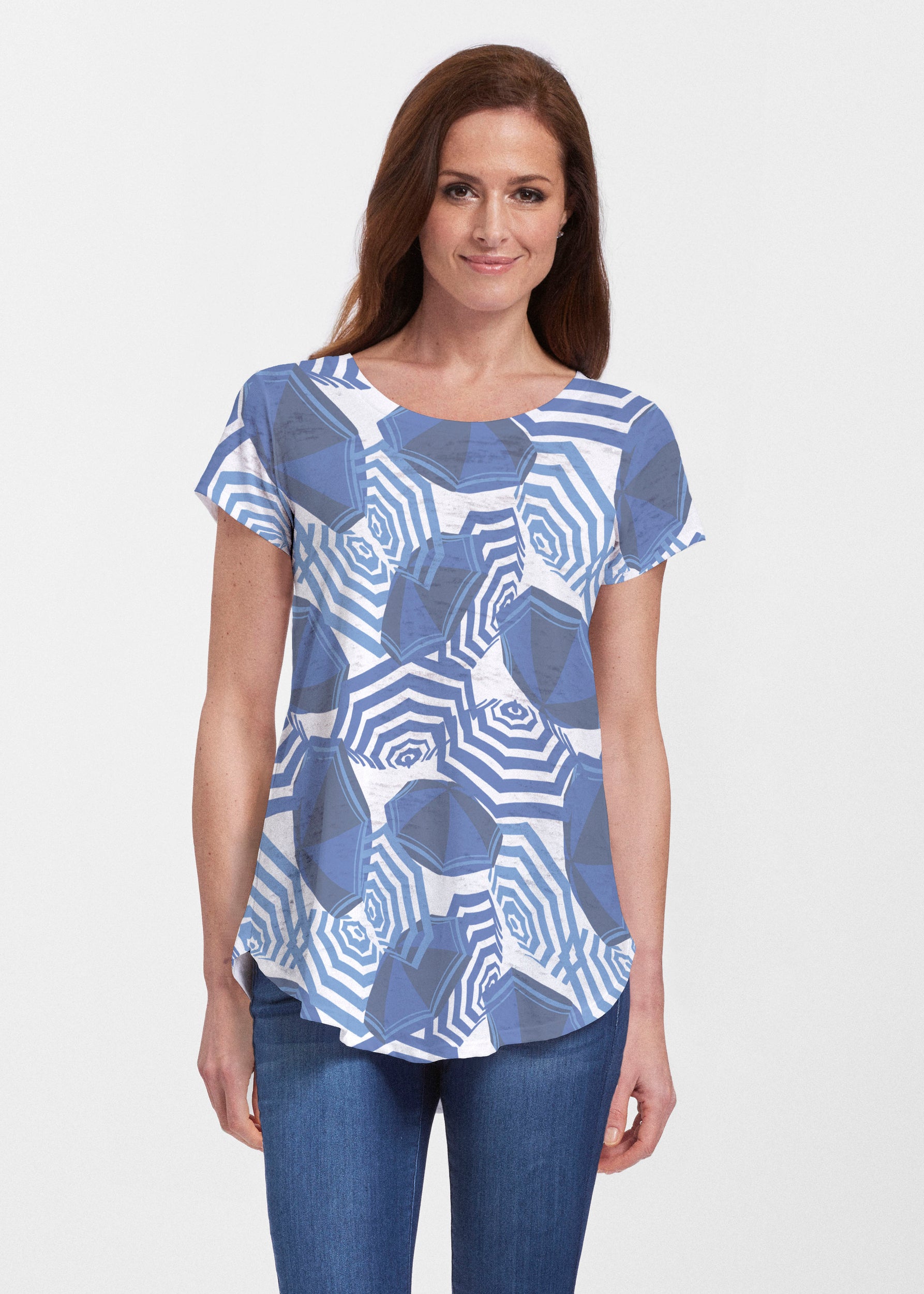 An effortlessly flattering tunic in our soft Signature burnout fabric featuring short sleeves and a scoop neck with a body that flows into a full, swinging shirttail hem.