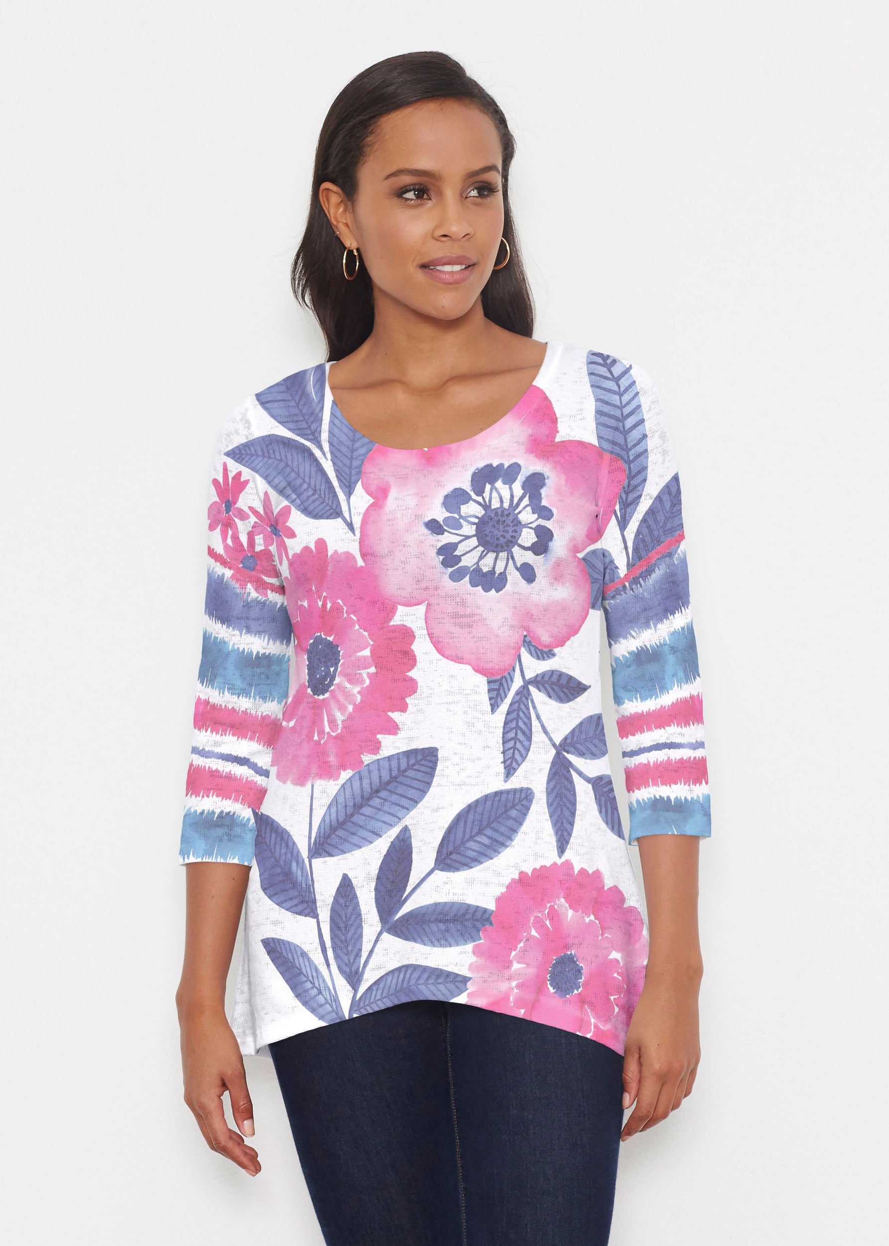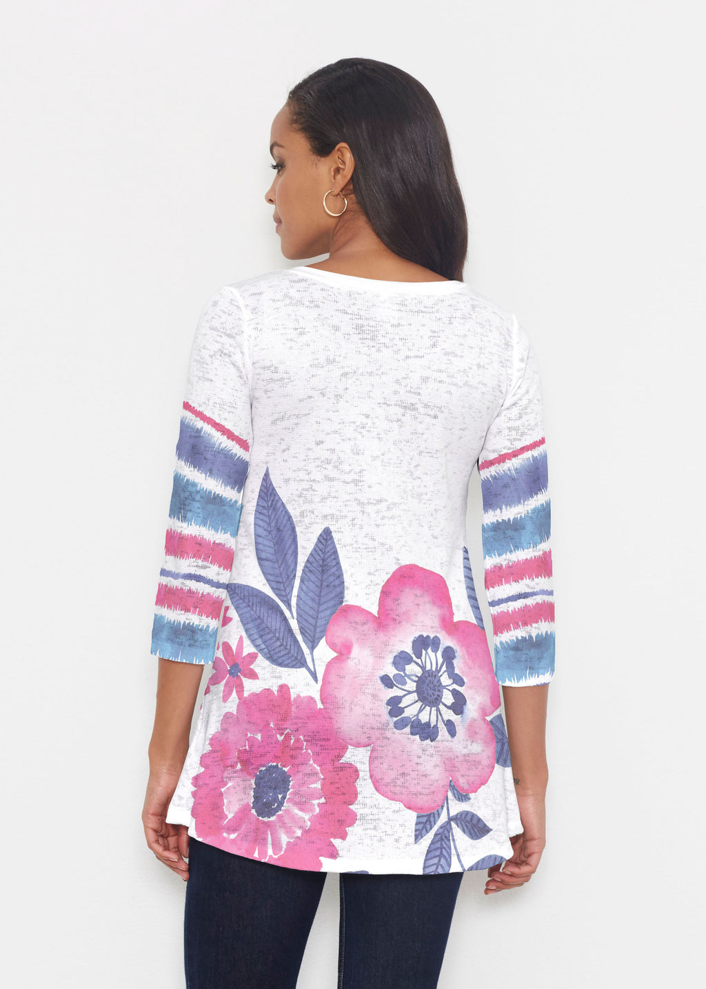 An elegant fit, the hemline falls higher in front then cascades beautifully down across back. Delicate scoop neckline and 3/4 sleeves made in our soft Baby Waffle burnout thermal blend.