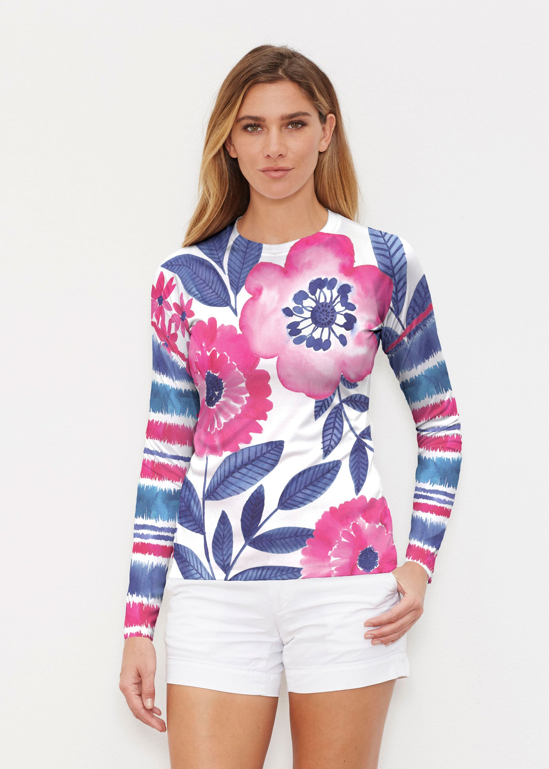 Our WHIMSY ROSE™ Safe Sun UPF 50+ long sleeve, crew neck rash guard offers versatile, beach-to-bistro style, supreme comfort, and an activewear fit. Made in a specially designed Safe Sun textile that blocks more harmful rays and provides a smart solution for those who love to swim, surf, kayak, canoe, waterski, boat, or simply relax waterside.