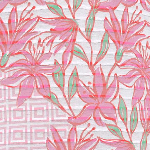 A vibrant portrayal of red & pink lillies amongst a pale pink geo background.