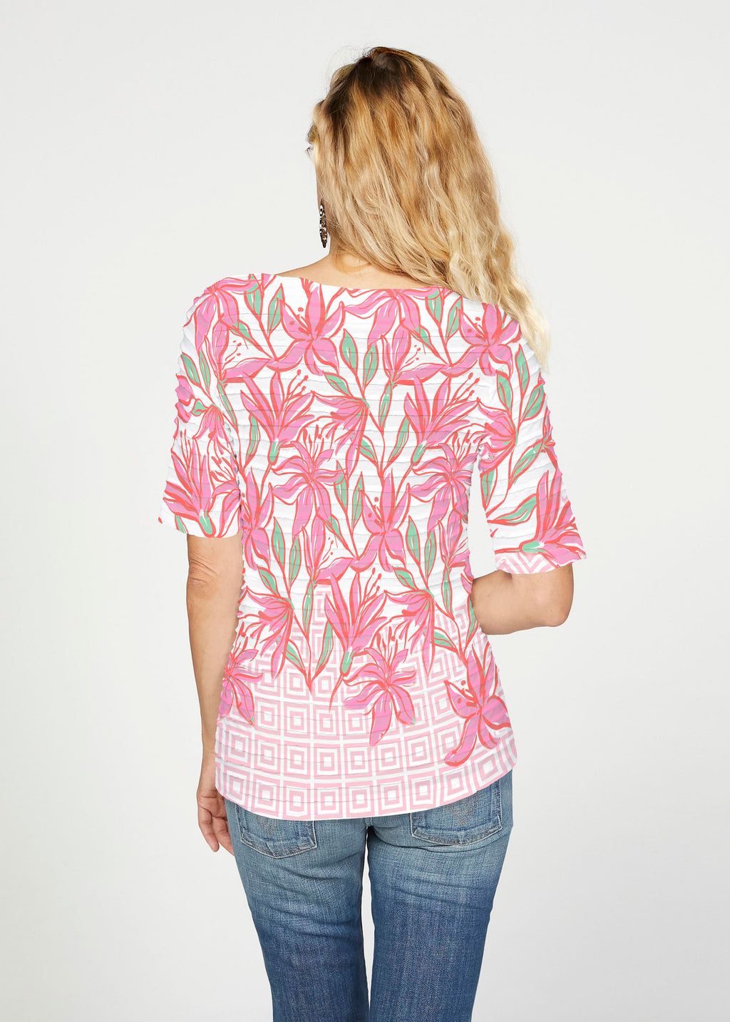 The uniquely soft, pleated texture in this Banded fabric gives the elbow sleeve and boat neck top a fun and sophisticated look. Easy relaxed fit with a hemline that comes below the hip.