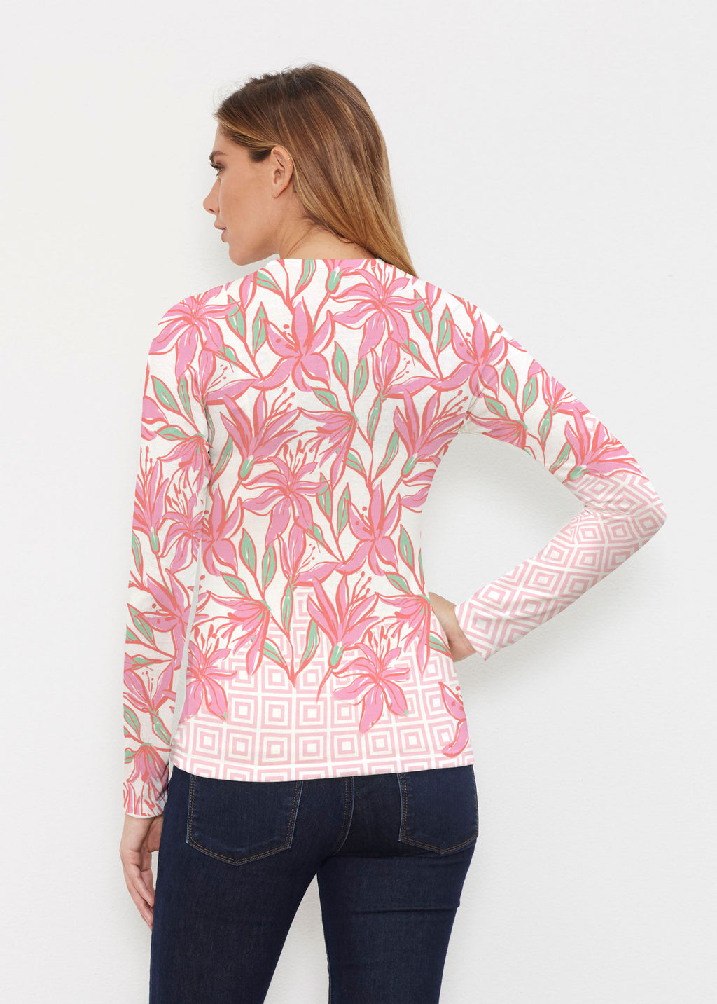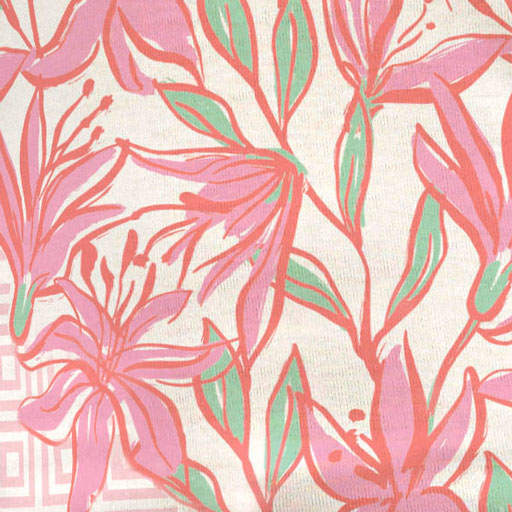 A vibrant portrayal of red & pink lillies amongst a pale pink geo background.