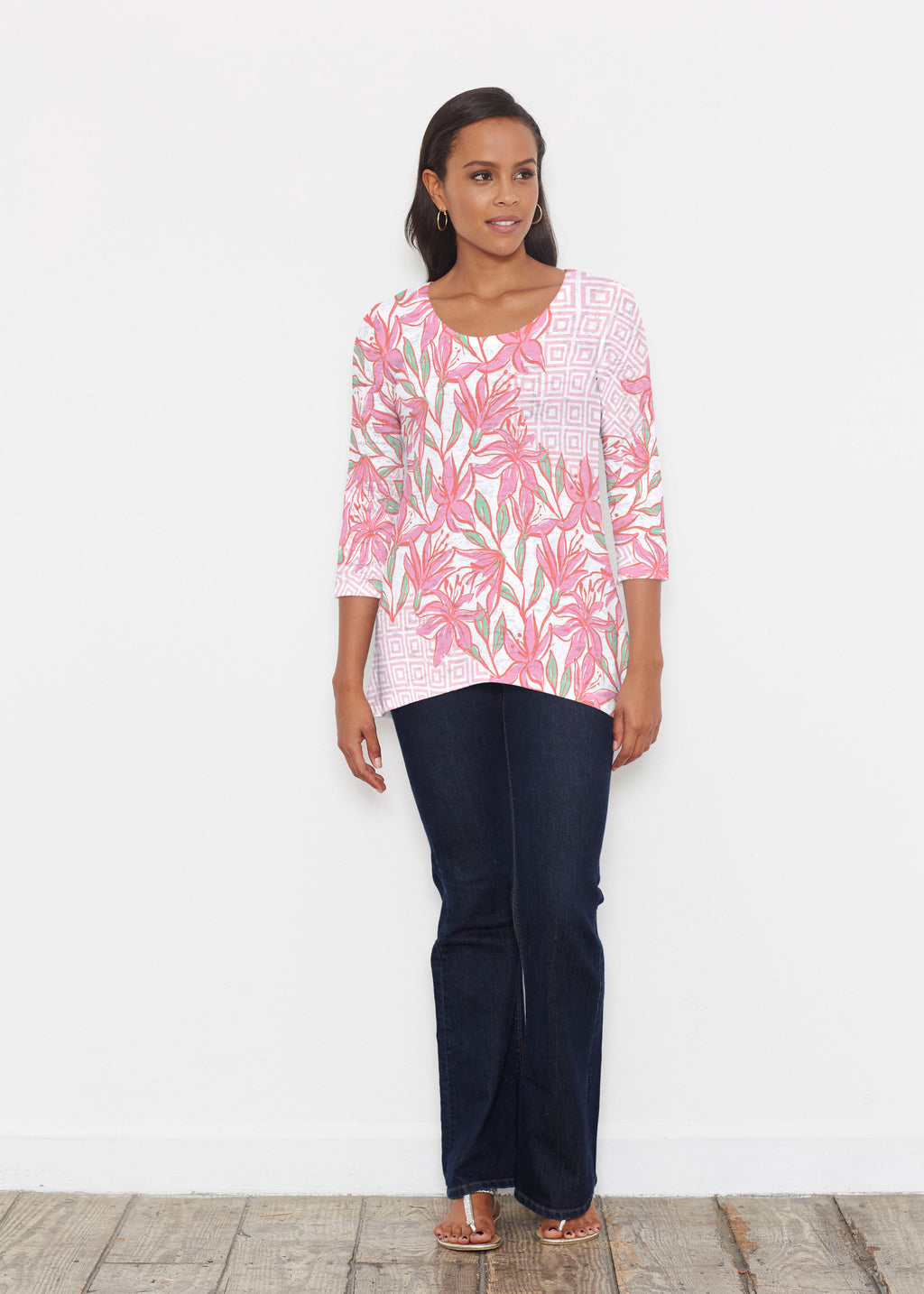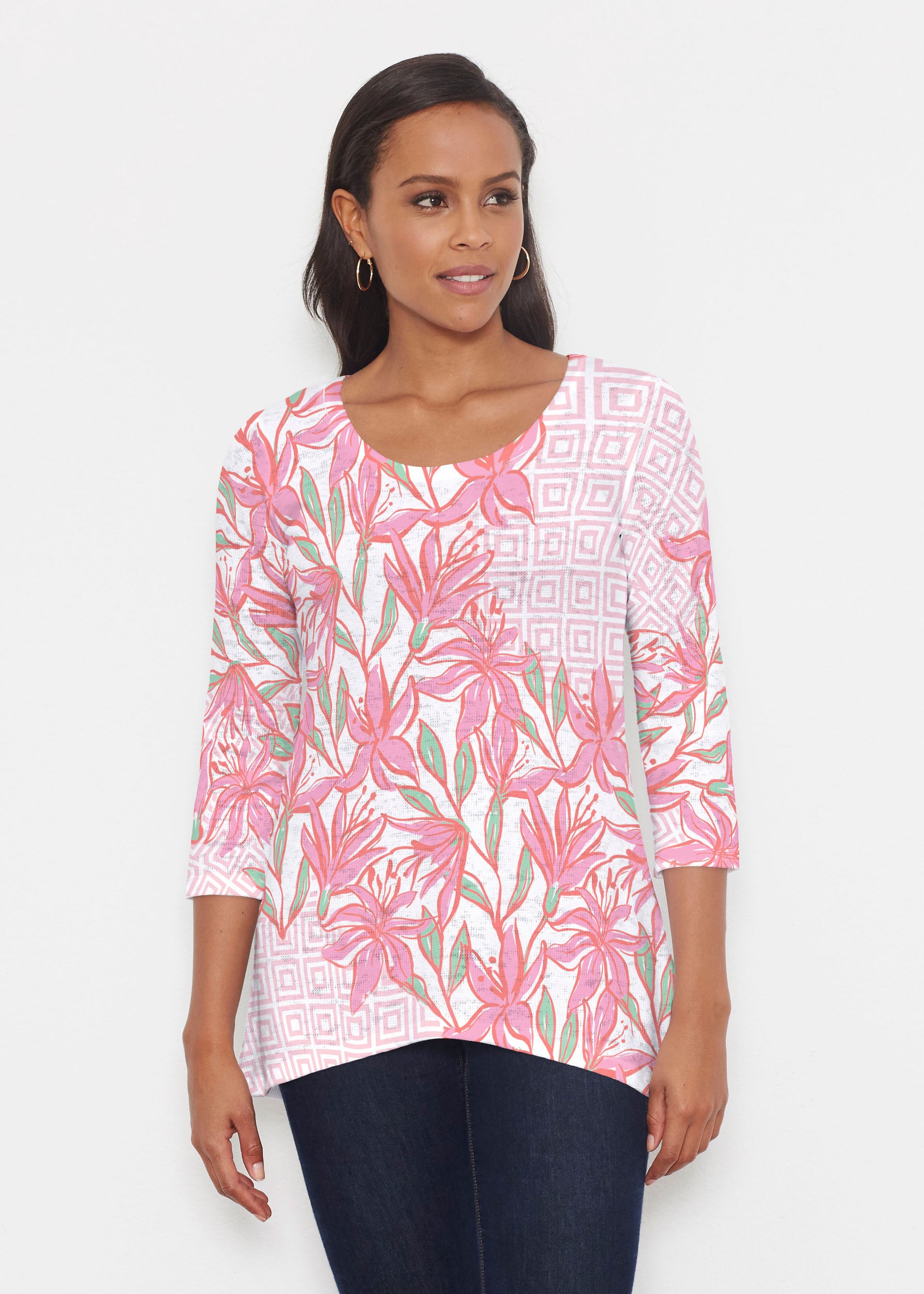 An elegant fit, the hemline falls higher in front then cascades beautifully down across back. Delicate scoop neckline and 3/4 sleeves made in our soft Baby Waffle burnout thermal blend.