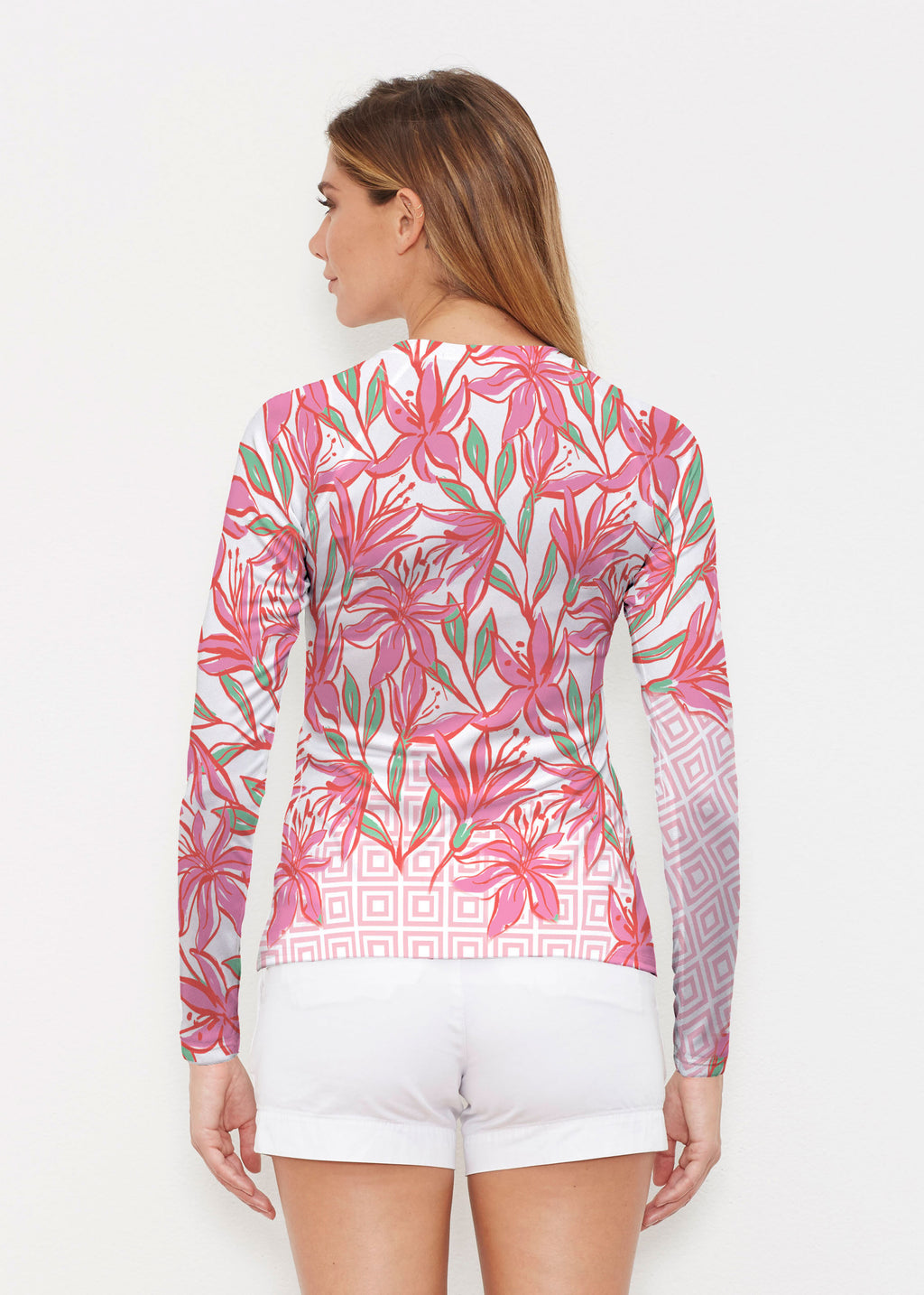 Our WHIMSY ROSE™ Safe Sun UPF 50+ long sleeve, crew neck rash guard offers versatile, beach-to-bistro style, supreme comfort, and an activewear fit. Made in a specially designed Safe Sun textile that blocks more harmful rays and provides a smart solution for those who love to swim, surf, kayak, canoe, waterski, boat, or simply relax waterside.
