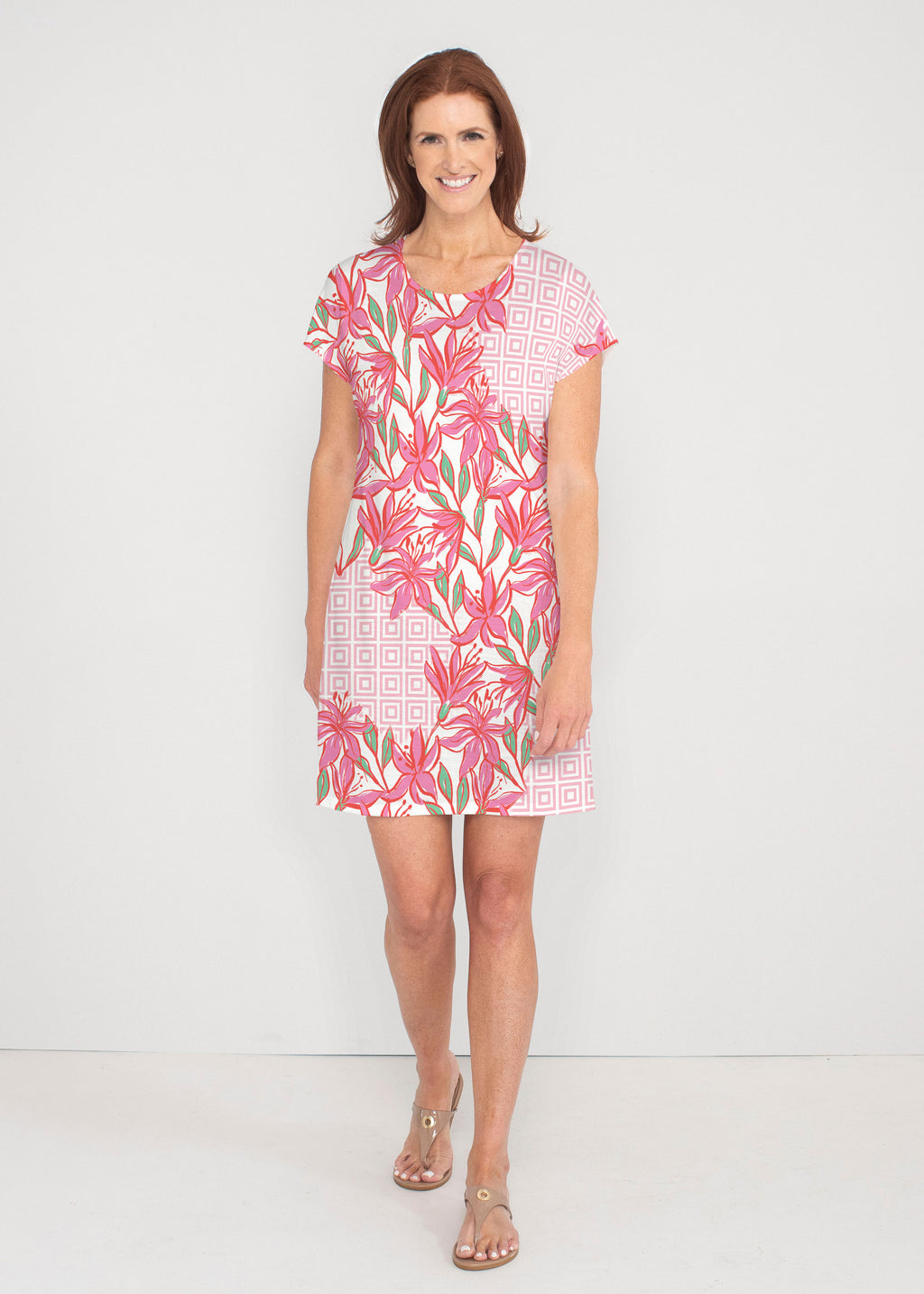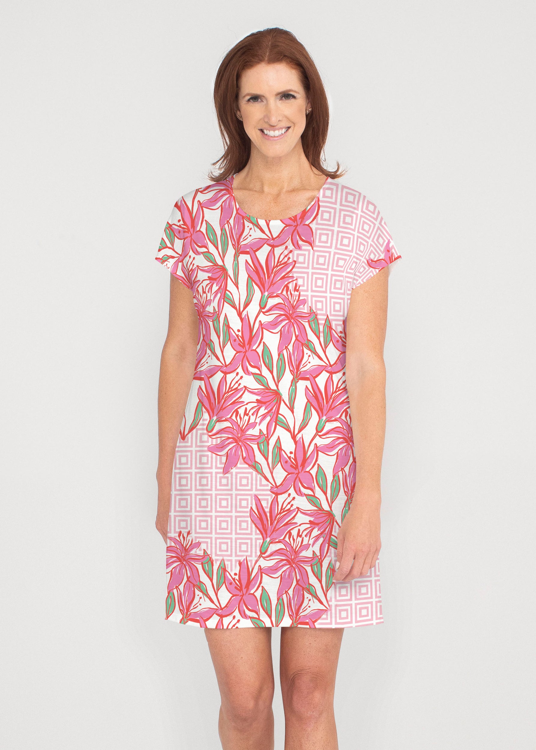 Our Lucy Tee Dress is effortless, versatile and soft to the touch -- perfect for all day style and comfort. A soft crew neckline, seamless sleeve and a relaxed shape made in our vibrant Lucy fabric ends above the knee.