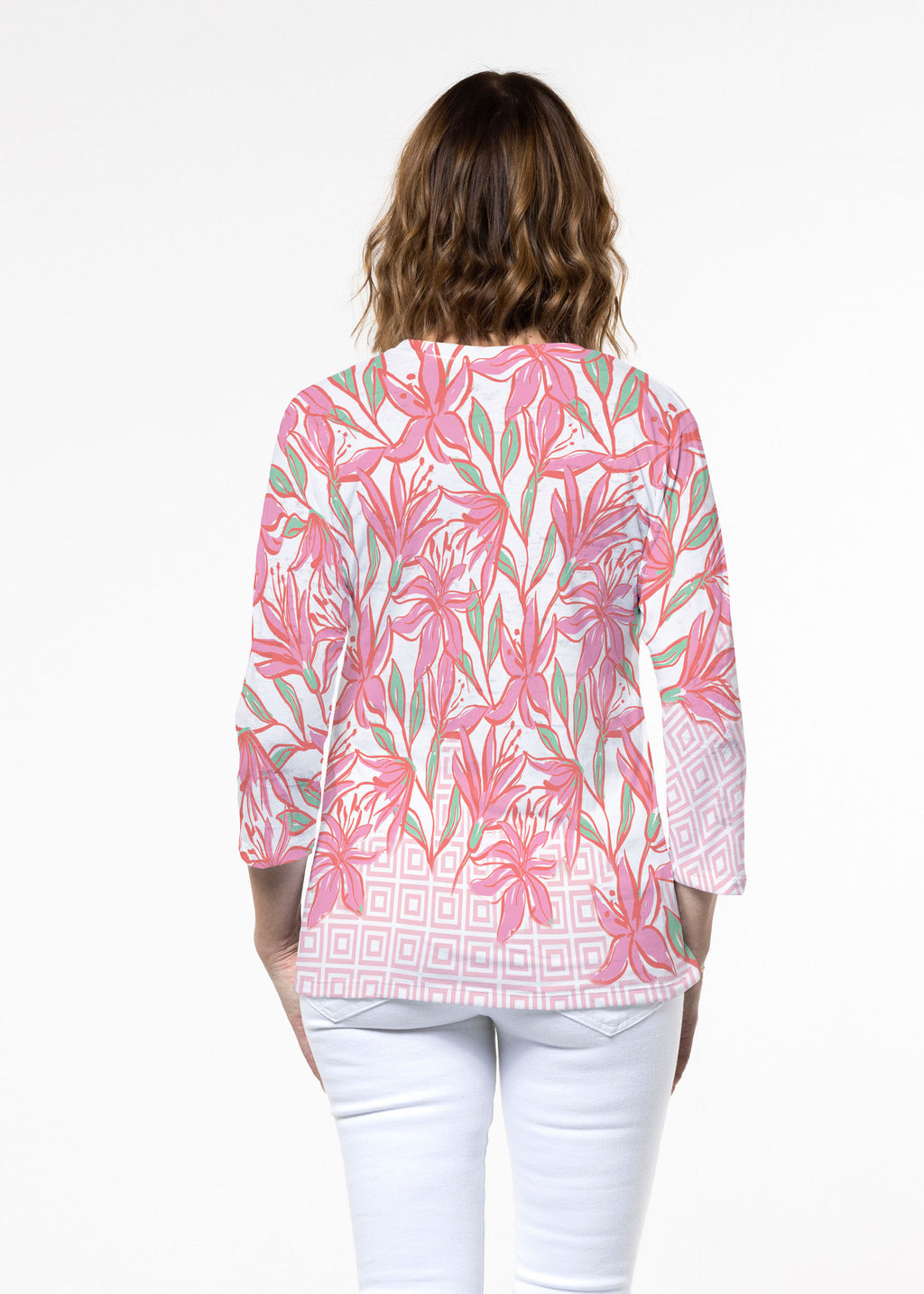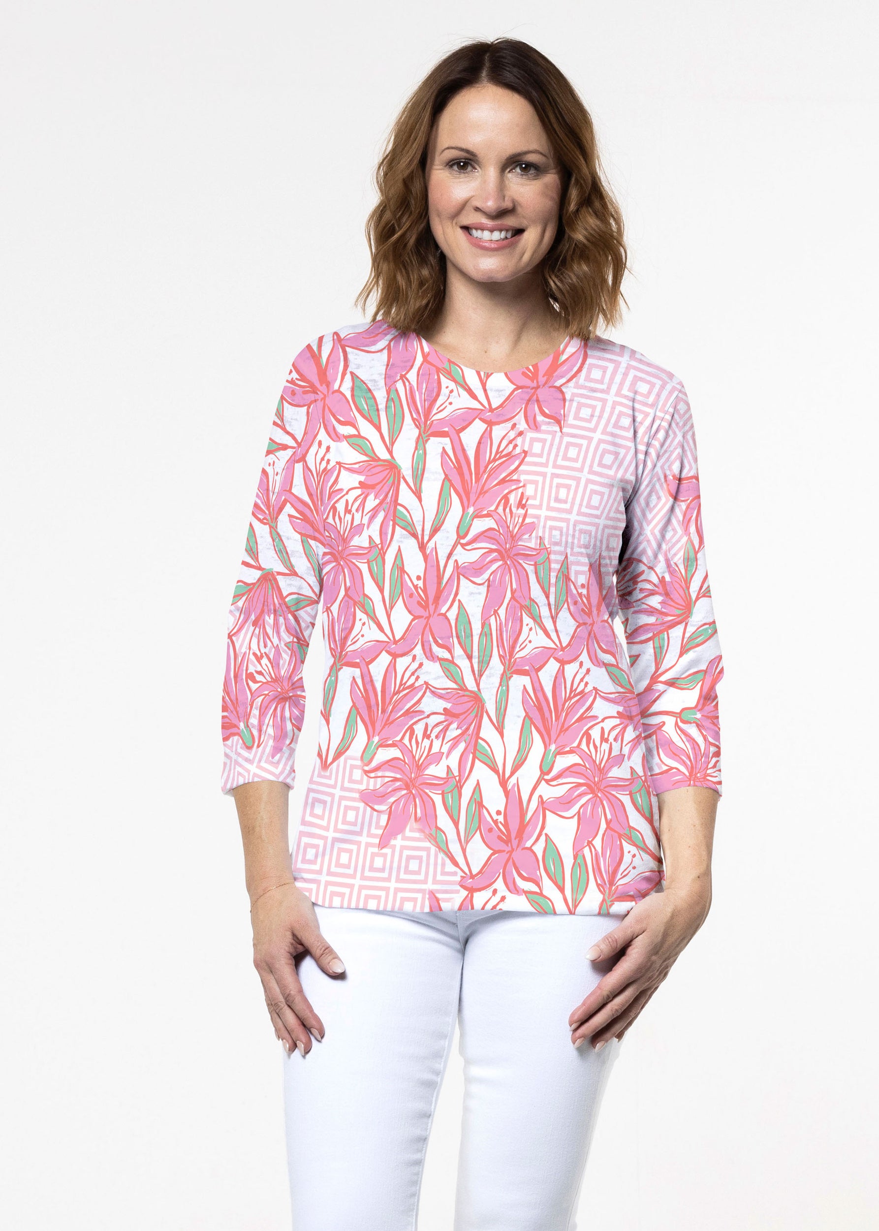 A vibrant portrayal of red & pink lillies amongst a pale pink geo background.