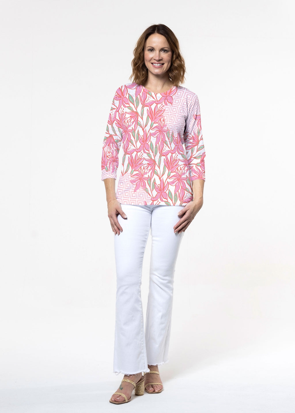 Flattering Signature fabric 3/4 sleeves and a crew neck are perfectly proportioned and more of a relaxed fit.