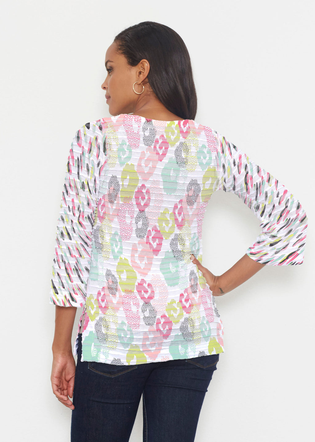 The uniquely soft, pleated texture in this Banded fabric give the 3/4 bell sleeves and sweetheart v-neck a fun and sophisticated look. Flattering side vents adorn the hemline that skims the hip.