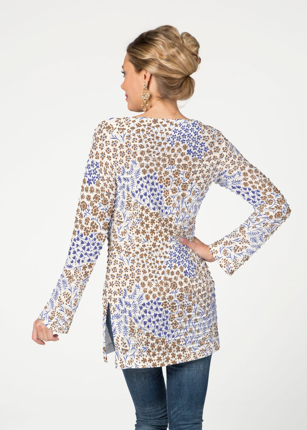 The Banded Boatneck Tunic has the soft pleated texture of our Banded fabric, making this a sophisticated, casual year round piece. A forgiving fit, side vents, with a relaxed full length sleeve combine for a flattering look. The hemline flows gently over the hip.