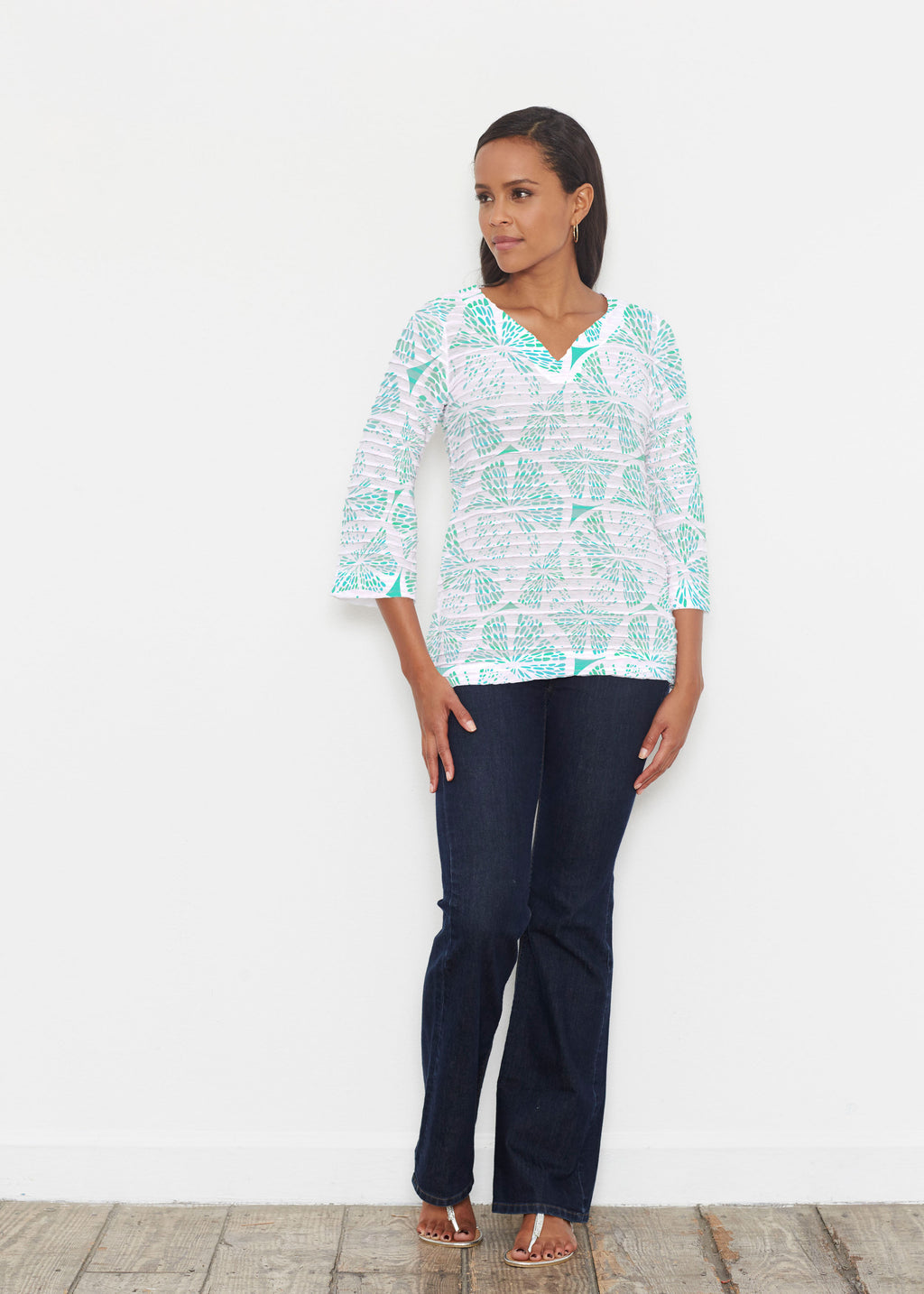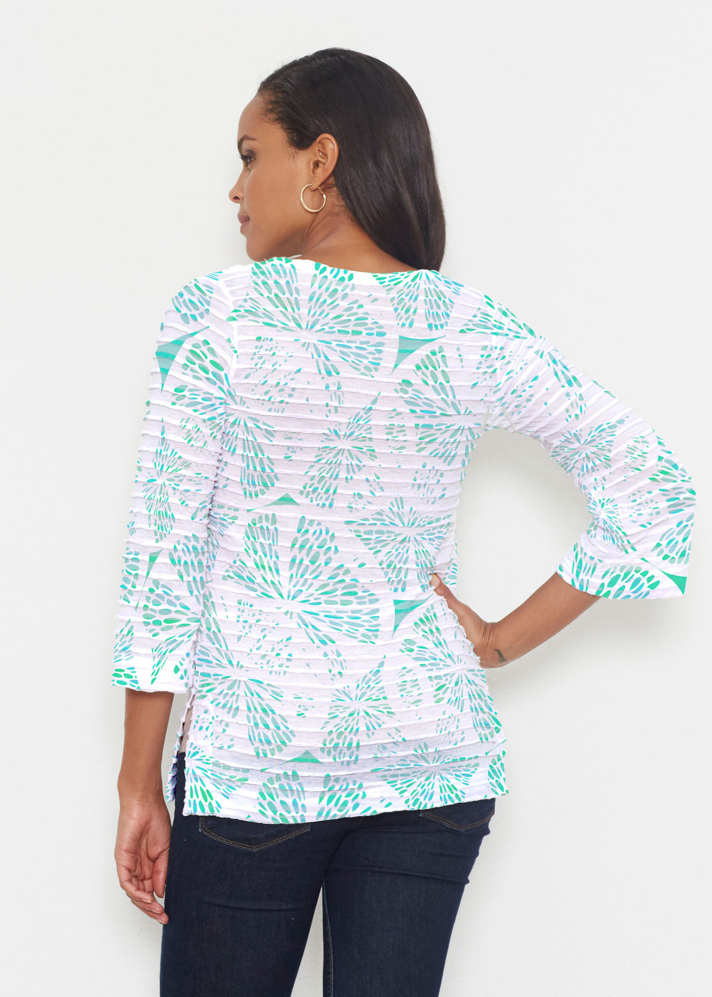 The uniquely soft, pleated texture in this Banded fabric give the 3/4 bell sleeves and sweetheart v-neck a fun and sophisticated look. Flattering side vents adorn the hemline that skims the hip.