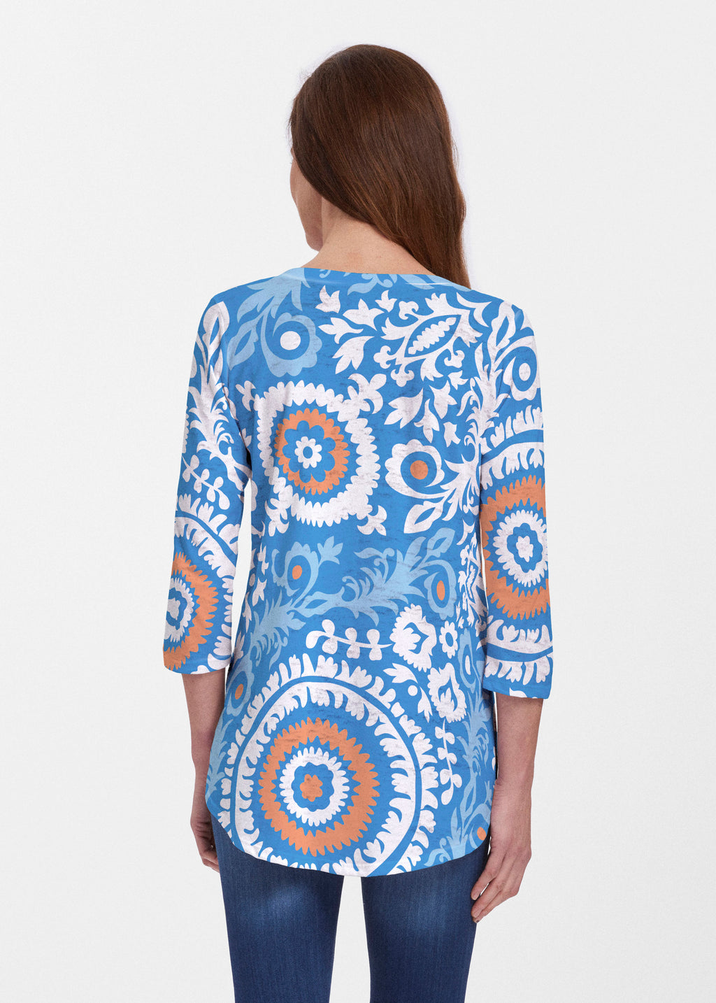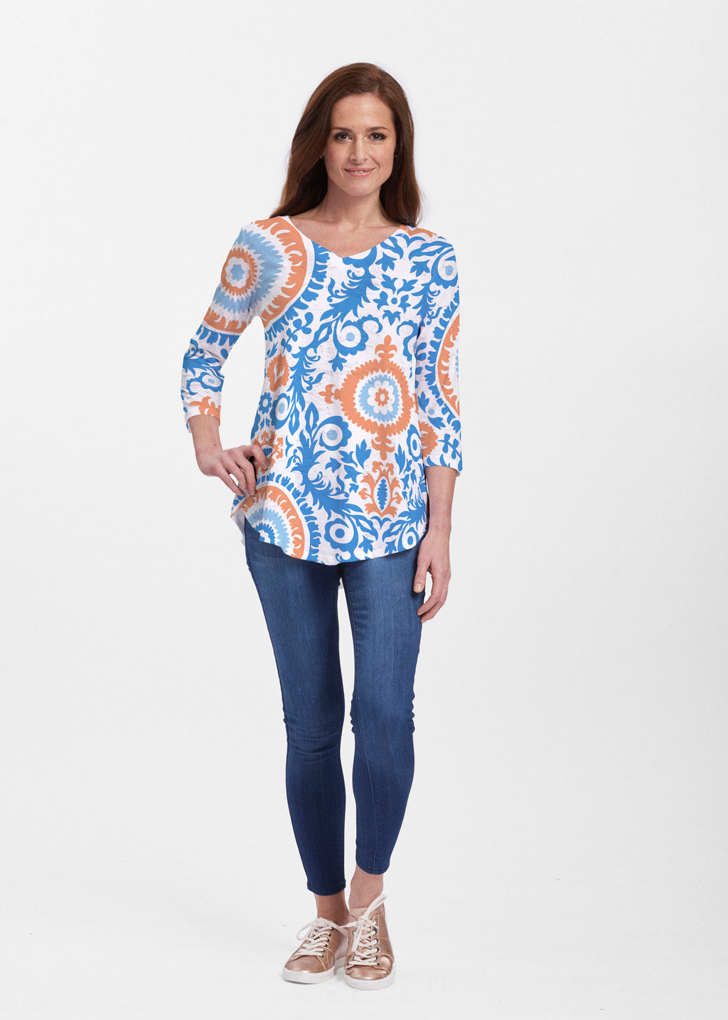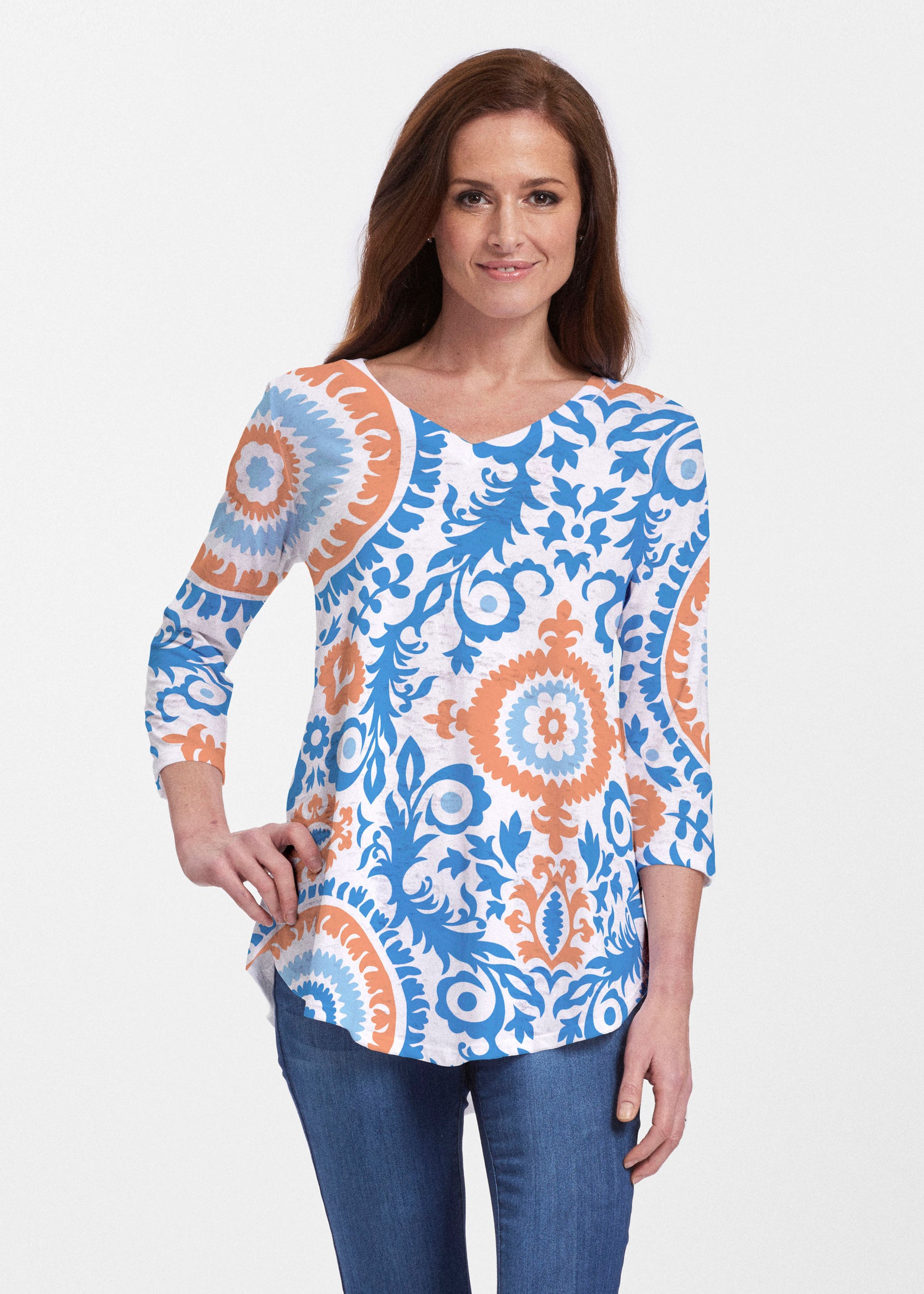 This v-neck tunic in our Signature burnout fabric is forever flattering. 3/4 sleeves and a v-neck flow into a full, swinging shirttail hem.