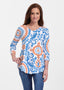 A playful mix of florals and geometric shapes in orange, aqua and navy with contrasting back to front color detail. Designed by Debra Valencia.
