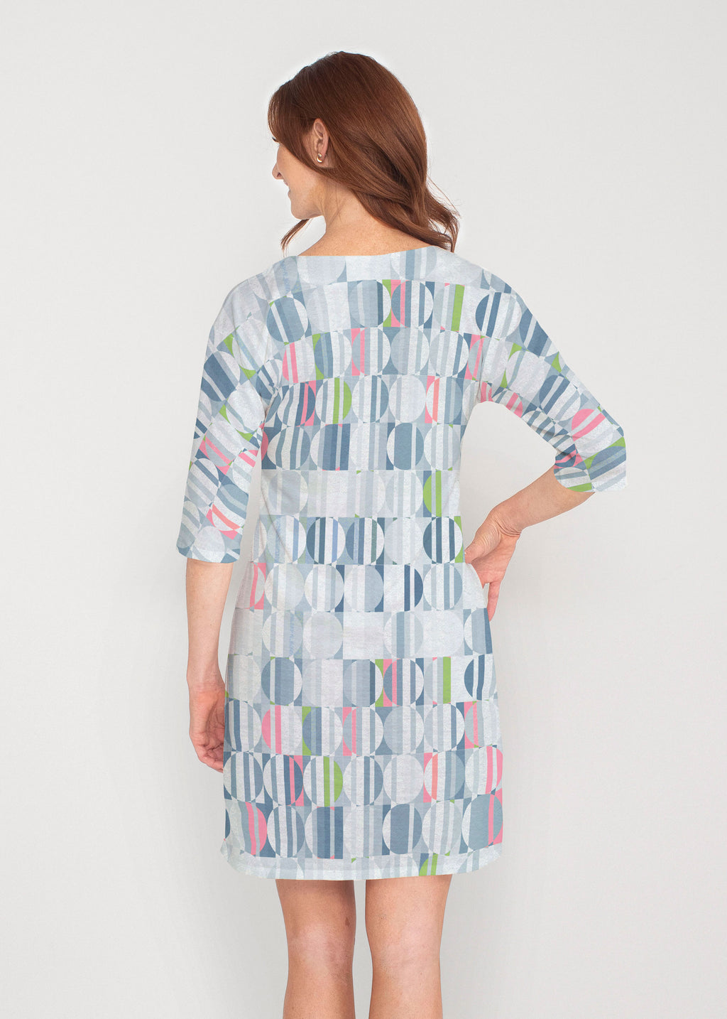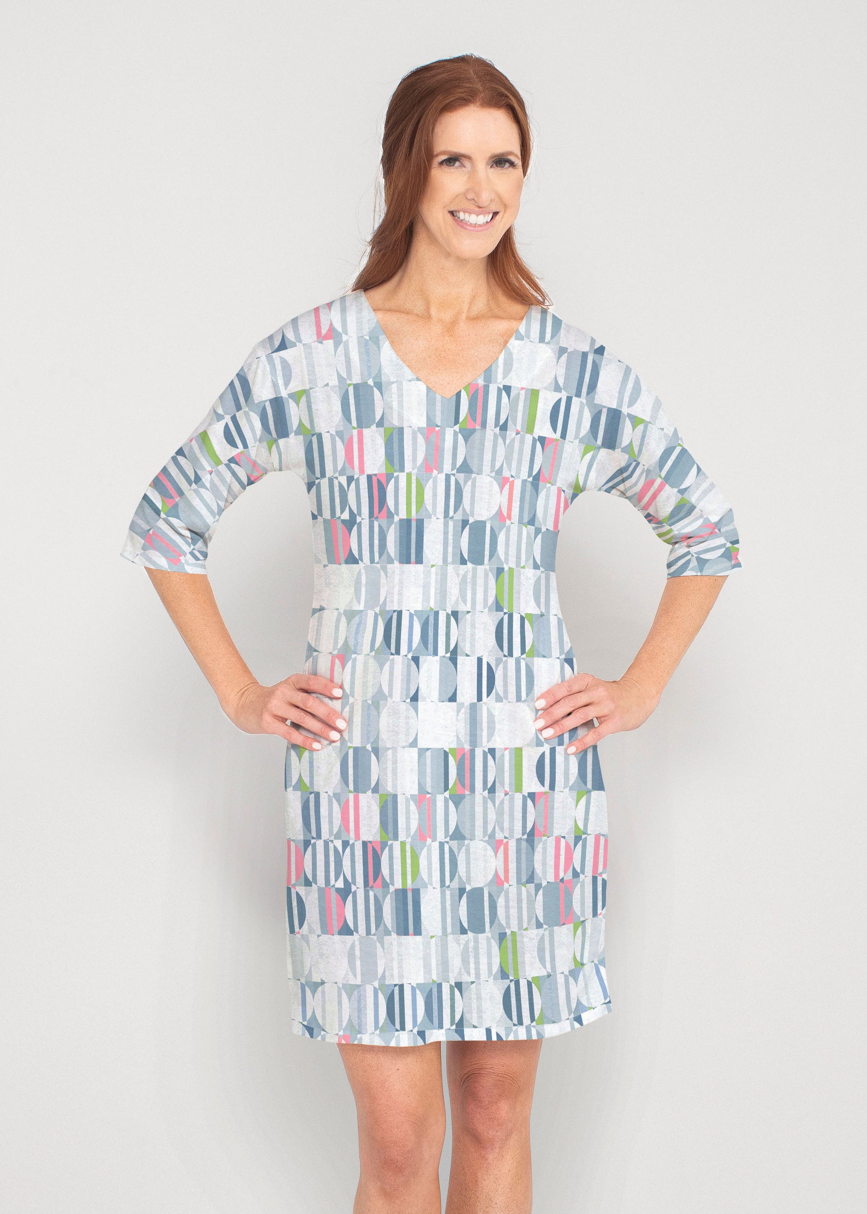 Be comfortable and fashionable all day in our light weight french terry fabric. This v-neck dress features loose 3/4 sleeves, drop shoulders and falls just at the knee.