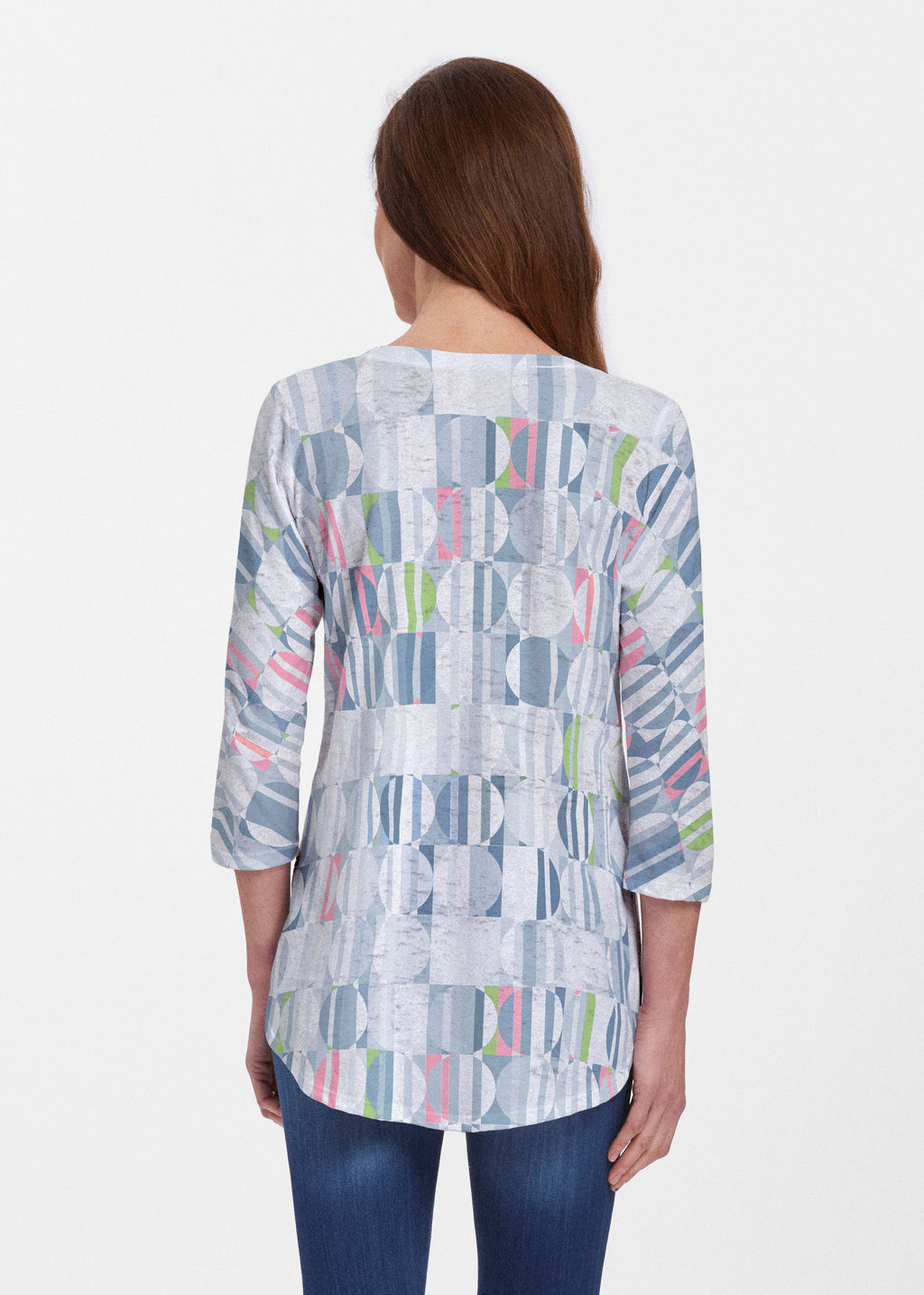 This v-neck tunic in our Signature burnout fabric is forever flattering. 3/4 sleeves and a v-neck flow into a full, swinging shirttail hem.