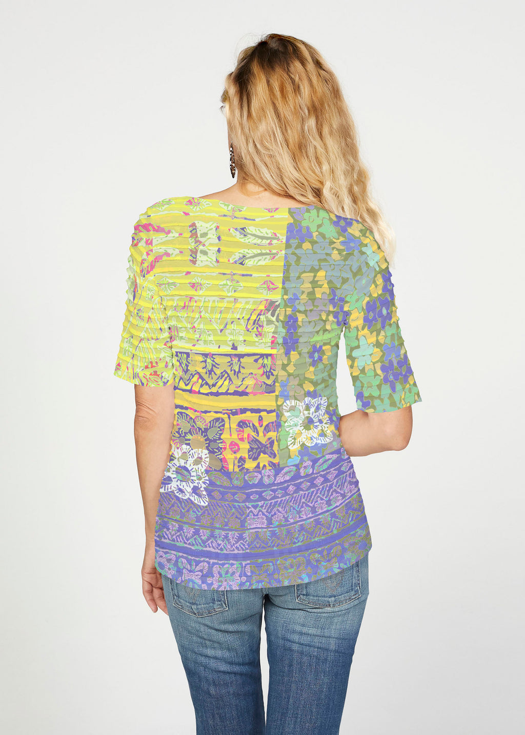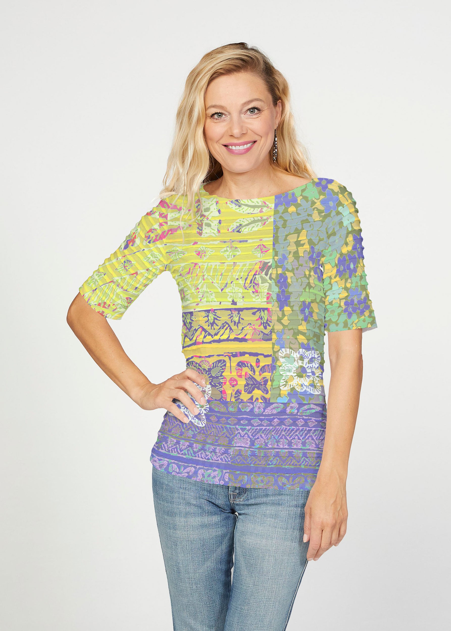 The uniquely soft, pleated texture in this Banded fabric gives the elbow sleeve and boat neck top a fun and sophisticated look. Easy relaxed fit with a hemline that comes below the hip.