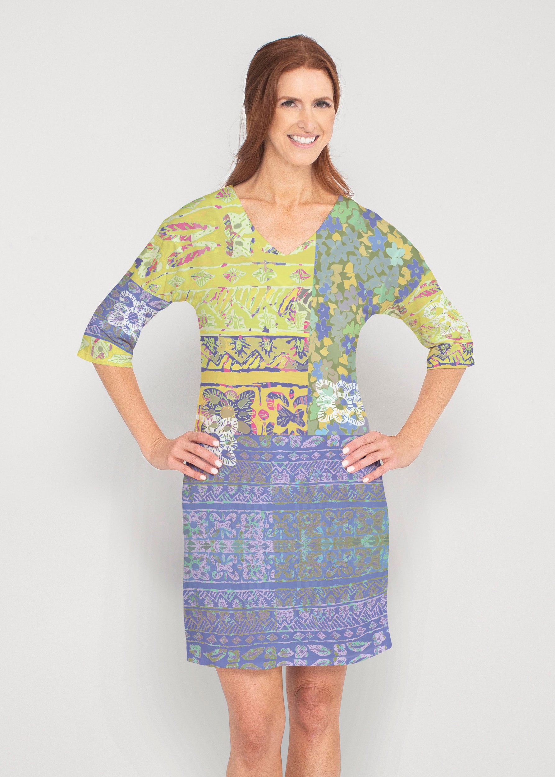Be comfortable and fashionable all day in our light weight french terry fabric. This v-neck dress features loose 3/4 sleeves, drop shoulders and falls just at the knee.