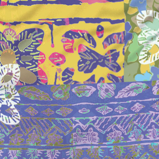 A playful collage of floral geometric yellows, purples, greys and pops of lime green.