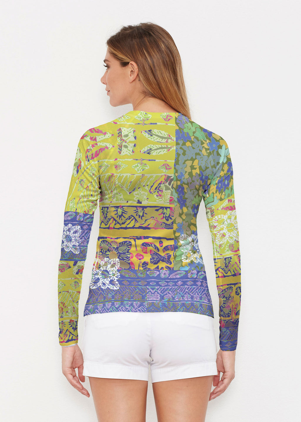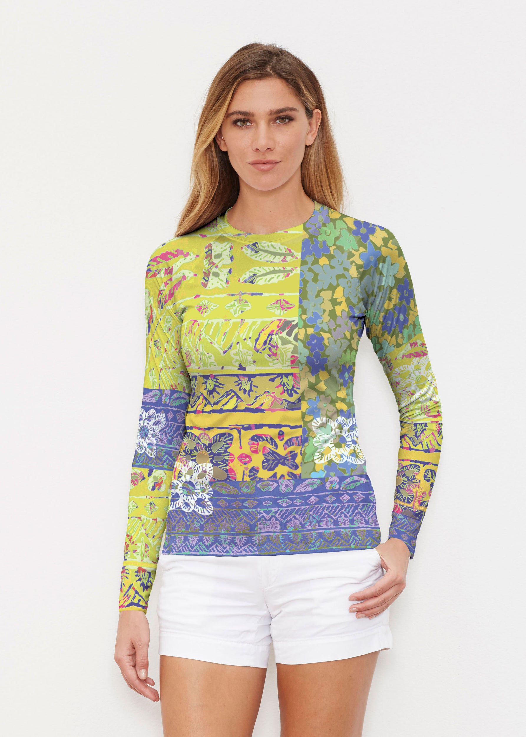 Our WHIMSY ROSE™ Safe Sun UPF 50+ long sleeve, crew neck rash guard offers versatile, beach-to-bistro style, supreme comfort, and an activewear fit. Made in a specially designed Safe Sun textile that blocks more harmful rays and provides a smart solution for those who love to swim, surf, kayak, canoe, waterski, boat, or simply relax waterside.