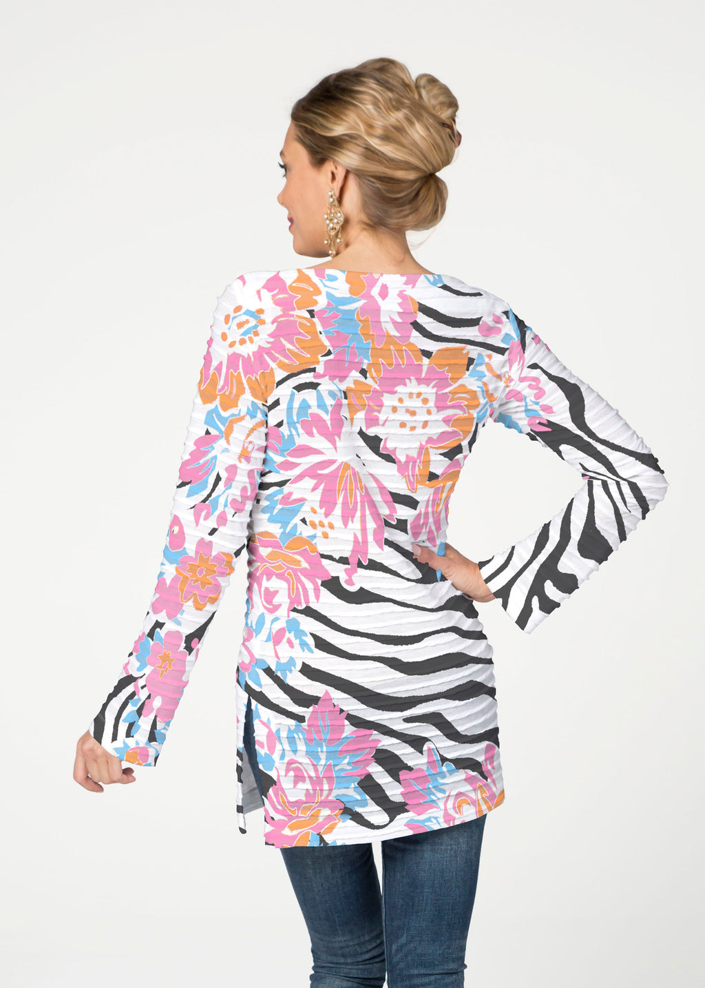 The Banded Boatneck Tunic has the soft pleated texture of our Banded fabric, making this a sophisticated, casual year round piece. A forgiving fit, side vents, with a relaxed full length sleeve combine for a flattering look. The hemline flows gently over the hip.