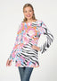 A playful black and white zebra print with scattered pops of flowers in pink, orange & light blue.