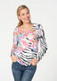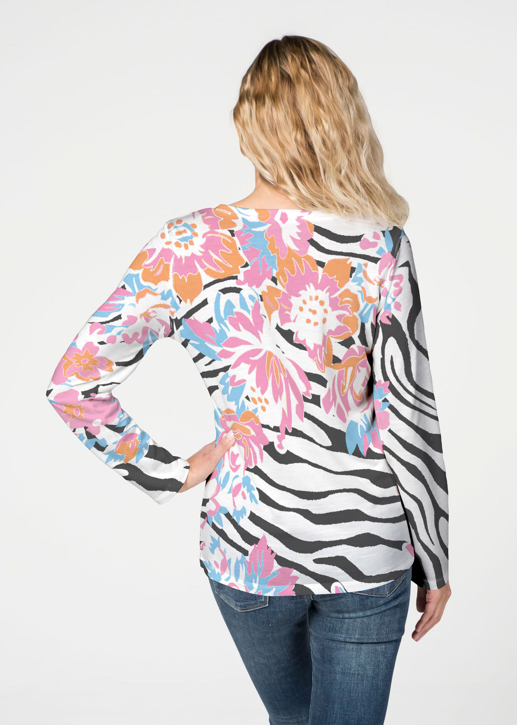 A playful black and white zebra print with scattered pops of flowers in pink, orange & light blue.