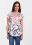 A playful black and white zebra print with scattered pops of flowers in pink, orange & light blue.