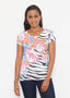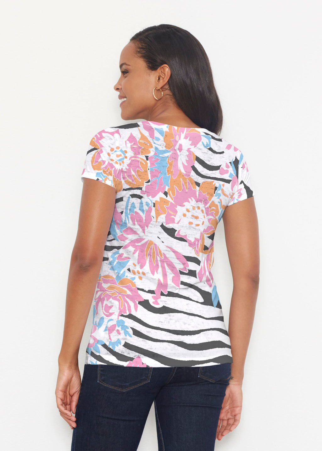 A playful black and white zebra print with scattered pops of flowers in pink, orange & light blue.