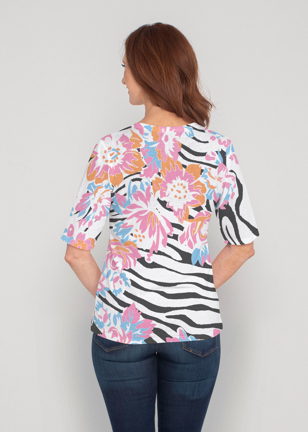 A playful black and white zebra print with scattered pops of flowers in pink, orange & light blue.