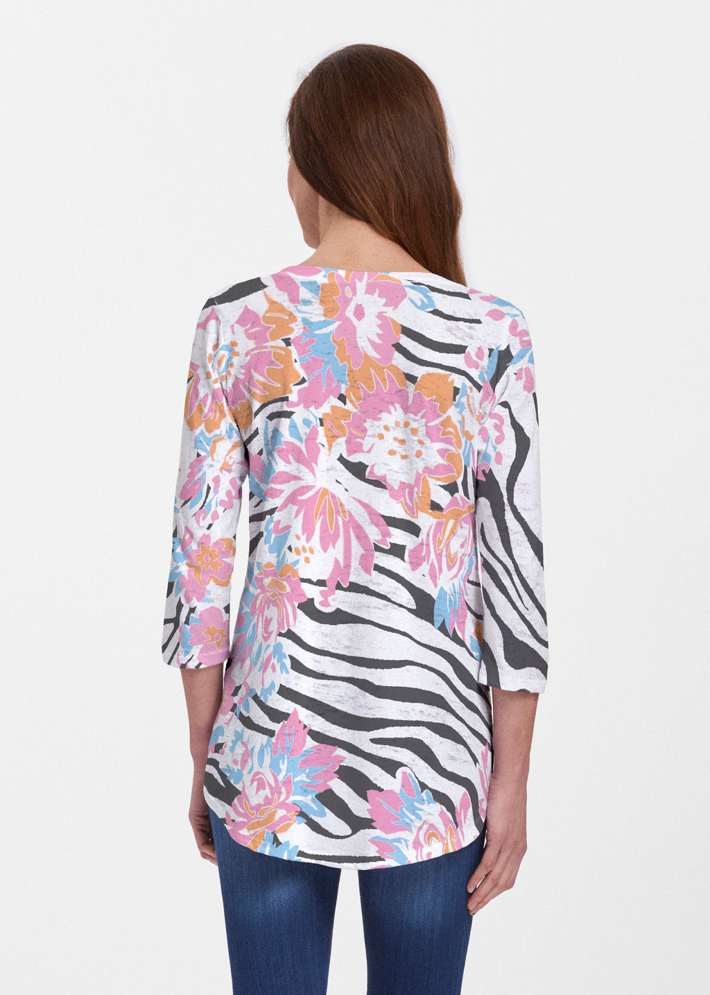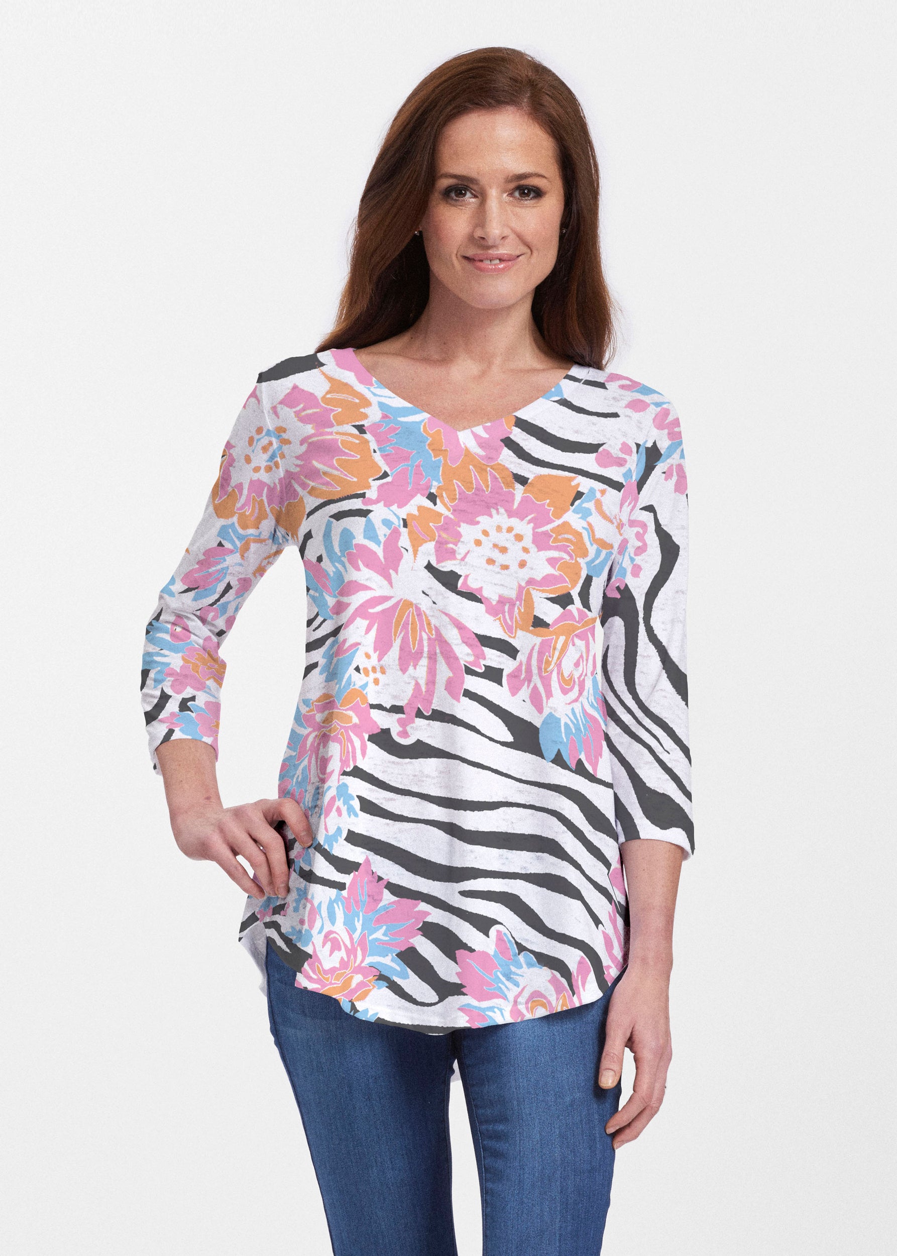 This v-neck tunic in our Signature burnout fabric is forever flattering. 3/4 sleeves and a v-neck flow into a full, swinging shirttail hem.