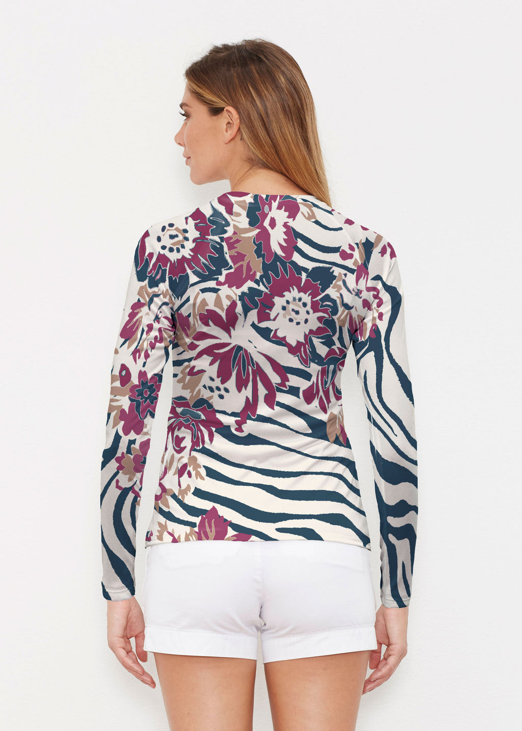 Our WHIMSY ROSE™ Safe Sun UPF 50+ long sleeve, crew neck rash guard offers versatile, beach-to-bistro style, supreme comfort, and an activewear fit. Made in a specially designed Safe Sun textile that blocks more harmful rays and provides a smart solution for those who love to swim, surf, kayak, canoe, waterski, boat, or simply relax waterside.