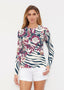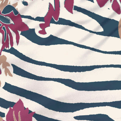 A playful navy and cream zebra print with scattered pops of flowers in burgundy, khaki & navy.