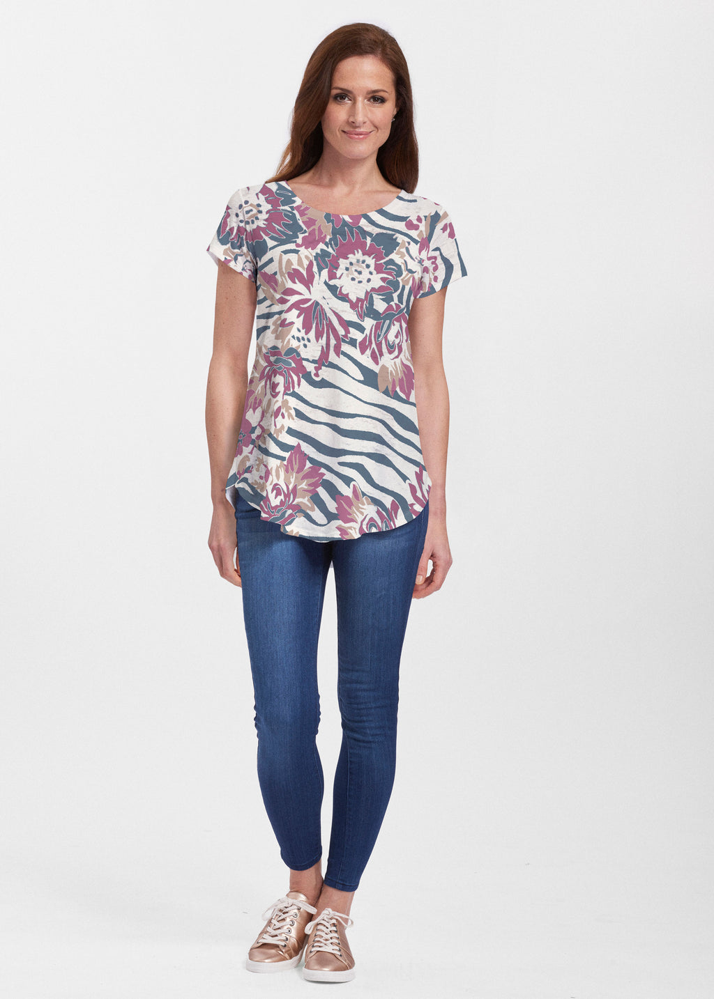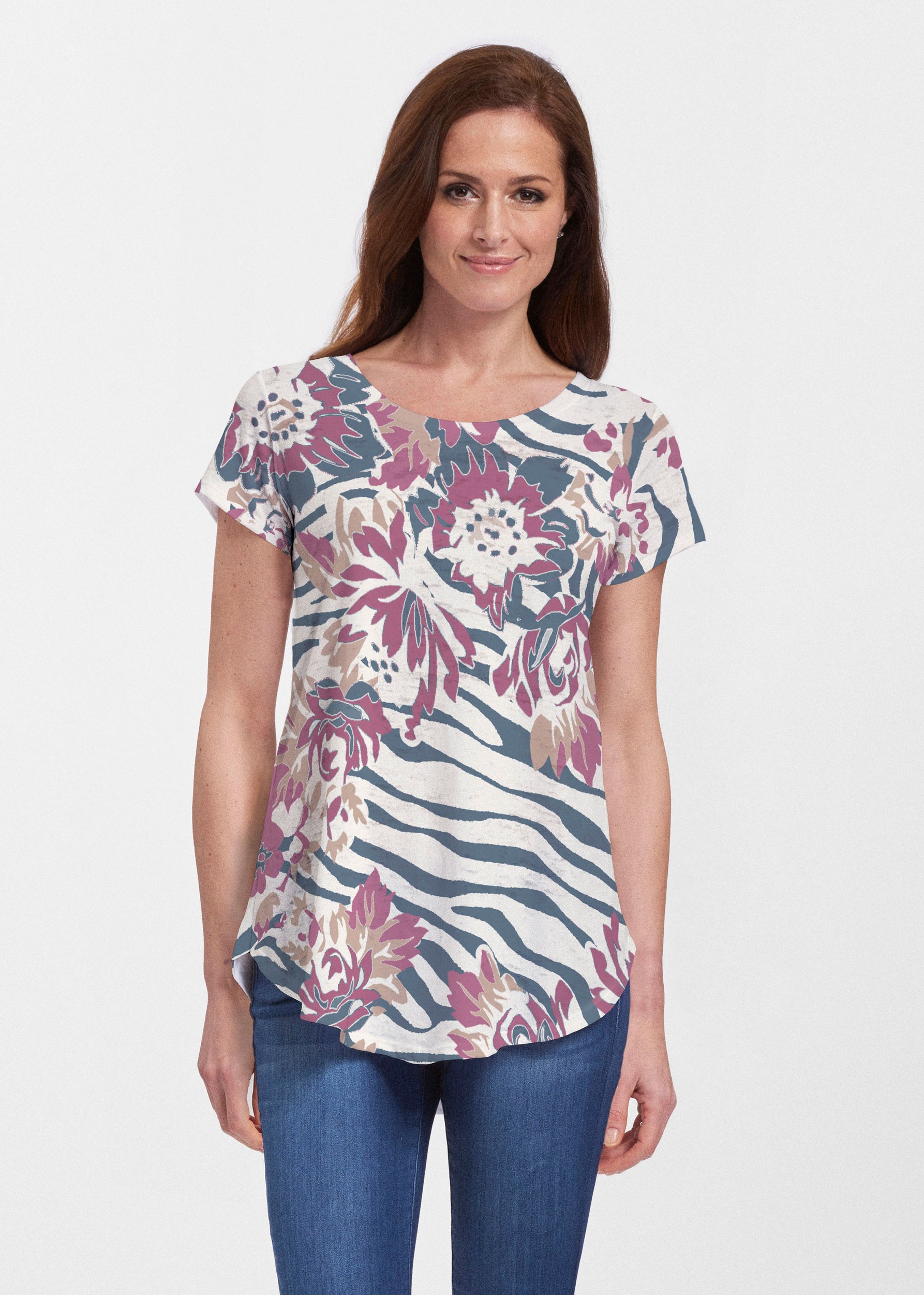 An effortlessly flattering tunic in our soft Signature burnout fabric featuring short sleeves and a scoop neck with a body that flows into a full, swinging shirttail hem.