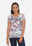 A playful navy and cream zebra print with scattered pops of flowers in burgundy, khaki & navy.