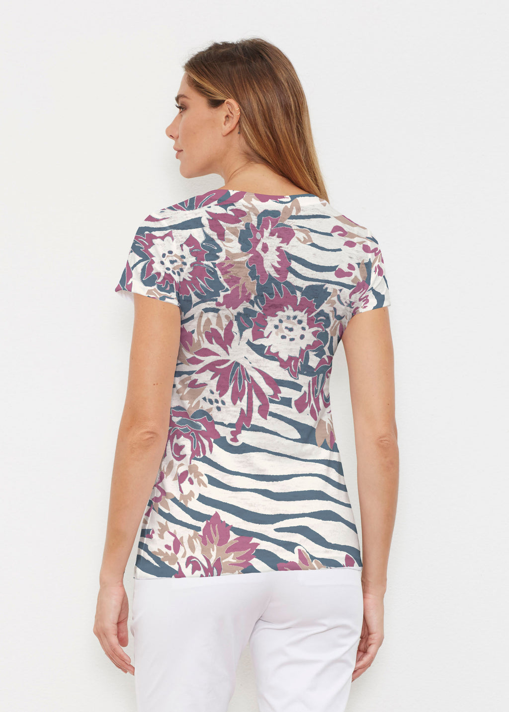 A playful navy and cream zebra print with scattered pops of flowers in burgundy, khaki & navy.