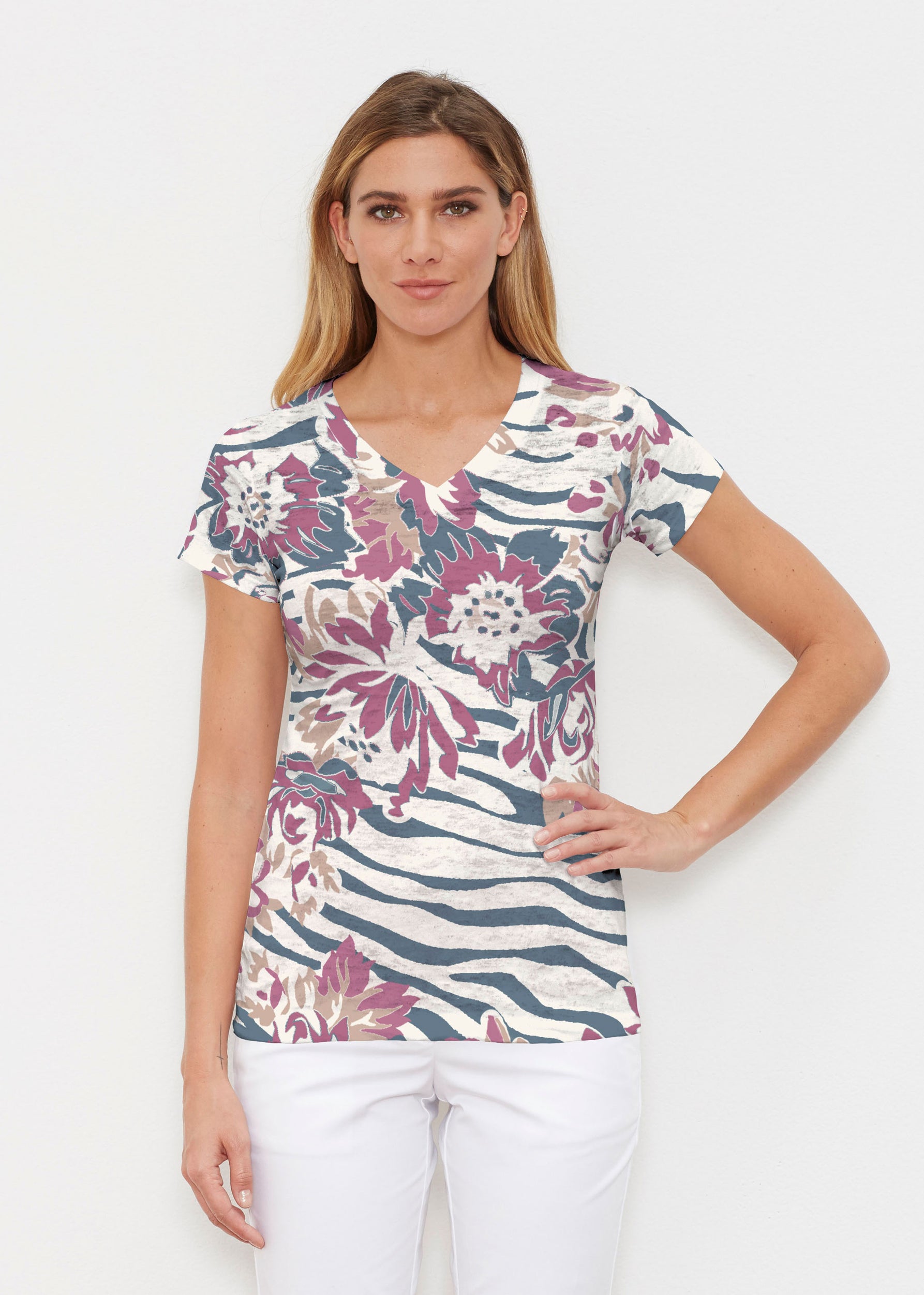 Created in soft, casual burn-out Signature blend, this tee features a subtle v-neck and cap sleeves.