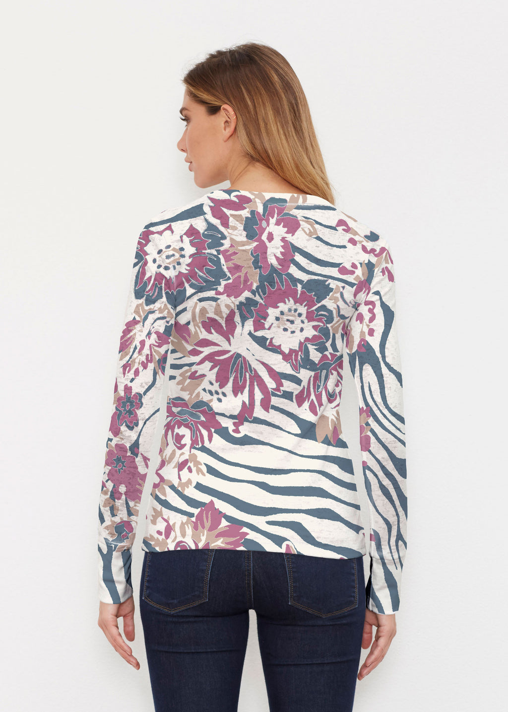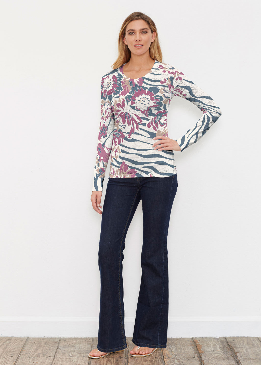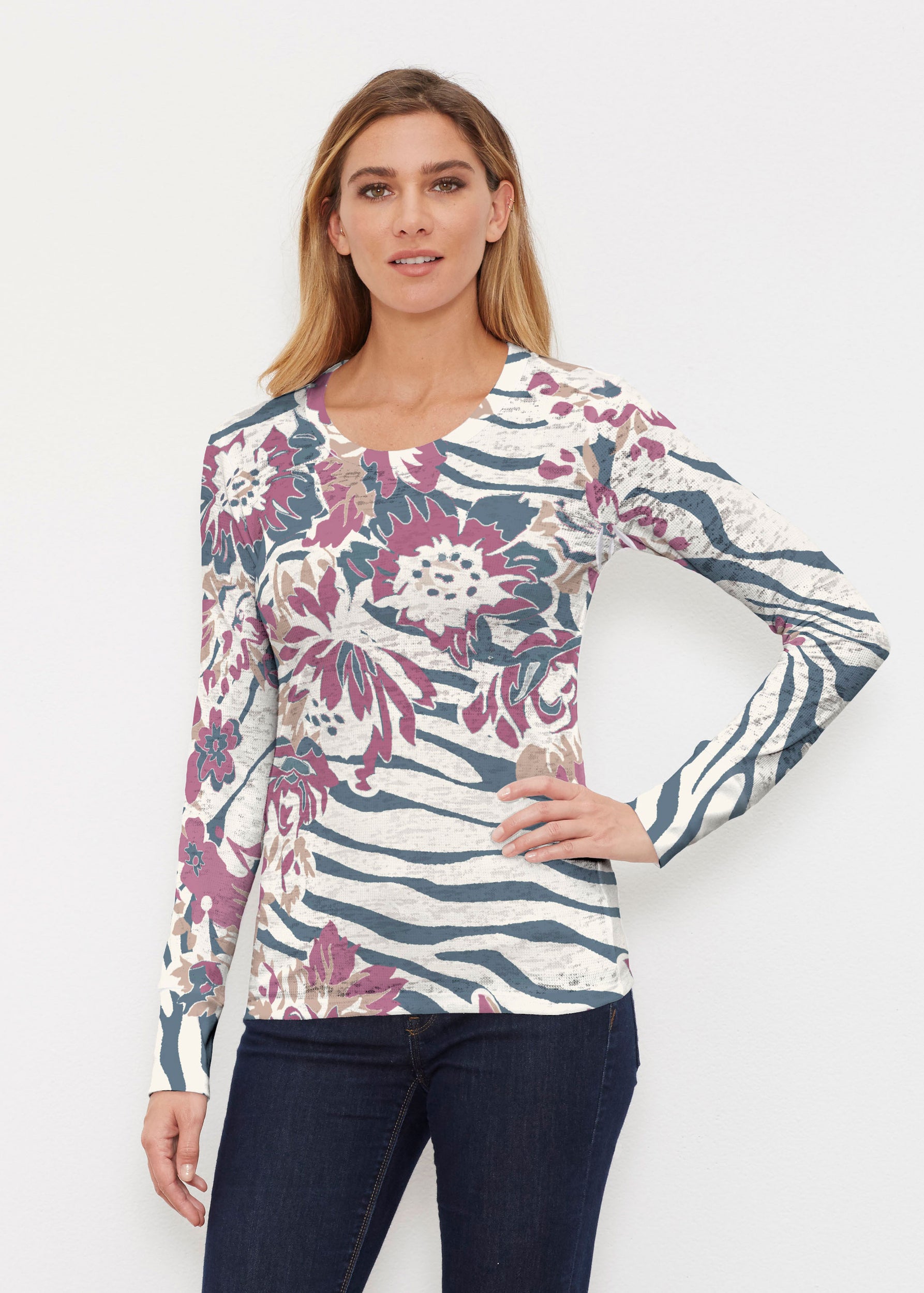 A playful navy and cream zebra print with scattered pops of flowers in burgundy, khaki & navy.