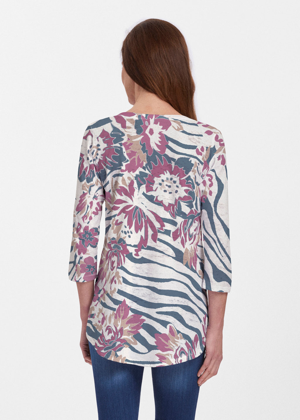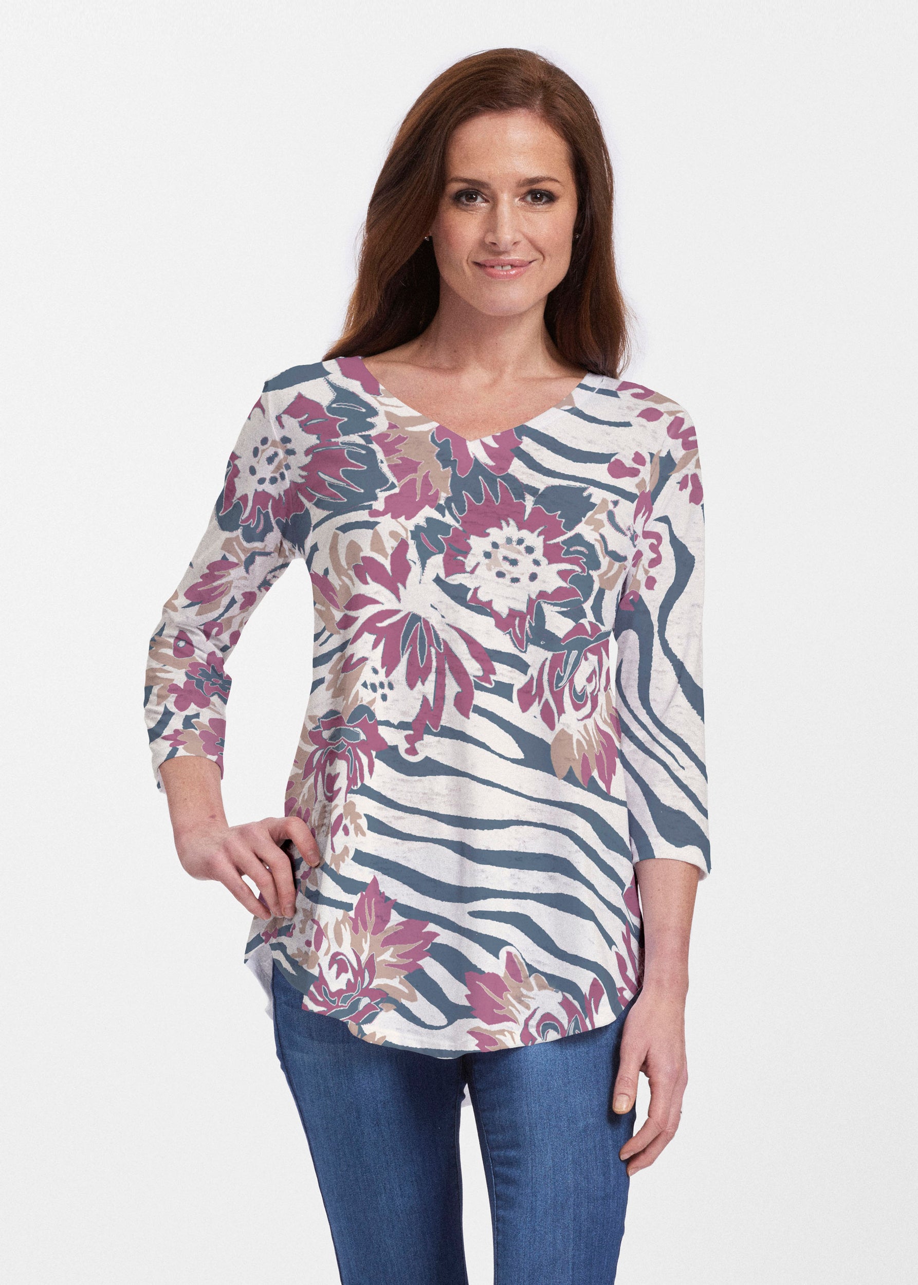 This v-neck tunic in our Signature burnout fabric is forever flattering. 3/4 sleeves and a v-neck flow into a full, swinging shirttail hem.